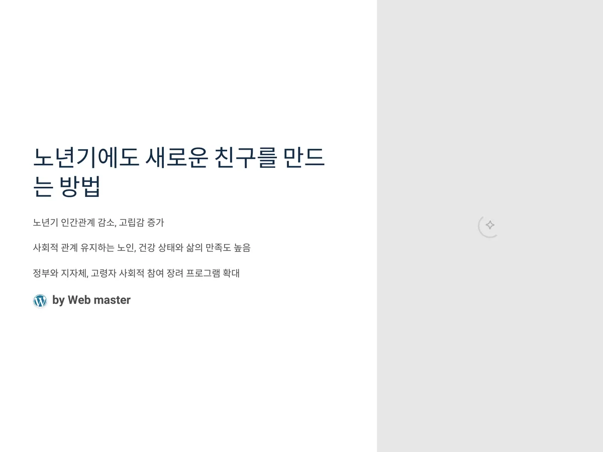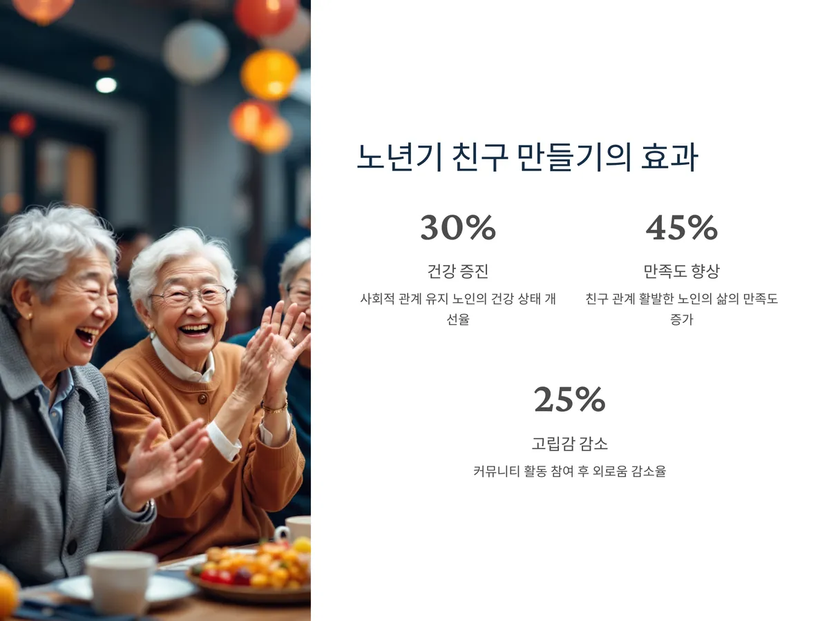 노년기에 접어들면서 인간관계가 점차 줄어들고 고립감을 느끼는 경우가 많습니다. 가족과의 관계에 집중되거나, 오랜 친구들과의 자연스러운 이별로 인해 새로운 관계를 만들 기회가 줄어드는 것이 일반적이죠. 하지만 최근 통계에 따르면 친구나 사회적 관계를 활발히 유지하는 노인은 그렇지 않은 사람보다 건강 상태가 양호하고, 삶의 만족도 또한 훨씬 높다고 보고되고 있습니다. 게다가 정부와 지자체에서도 고령자의 사회적 참여를 장려하며 다양한 커뮤니티 프로그램을 확대하는 추세입니다. 이러한 흐름 속에서 노년기에도 충분히 새로운 인연을 만들 수 있으며, 이를 위한 구체적이고 실현 가능한 방법들이 점점 더 다양해지고 있습니다.