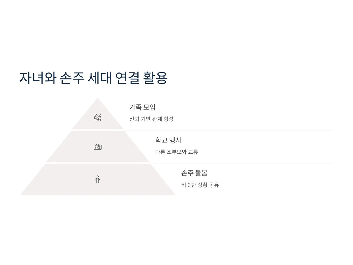 노년기의 새로운 친구 만들기에서 흔히 간과되는 부분이 바로 자녀나 손주의 친구 및 부모들과의 연결입니다. 아이들의 학교 행사, 가족 모임, 마을잔치 등에서 만나는 사람들과의 교류도 좋은 인연이 될 수 있습니다. 특히 손주를 돌보는 과정에서 같은 연령대의 조부모들과 자연스럽게 교류하게 되는 경우도 많습니다.