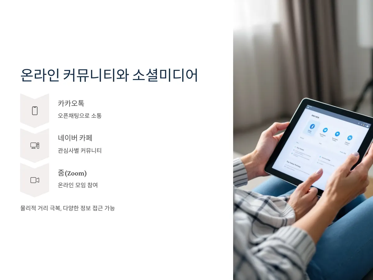 디지털 기기의 보급과 함께 노년층도 온라인 커뮤니티 활동에 점점 익숙해지고 있습니다. 카카오톡 오픈채팅, 네이버 카페, 밴드 등에서는 중장년층을 위한 다양한 주제의 커뮤니티가 운영되고 있어 공통의 관심사를 가진 사람들과 쉽게 교류할 수 있습니다. 특히 스마트폰이나 태블릿에 익숙하다면 줌(Zoom) 등을 활용한 온라인 독서모임이나 토론모임에도 참여해볼 수 있습니다.