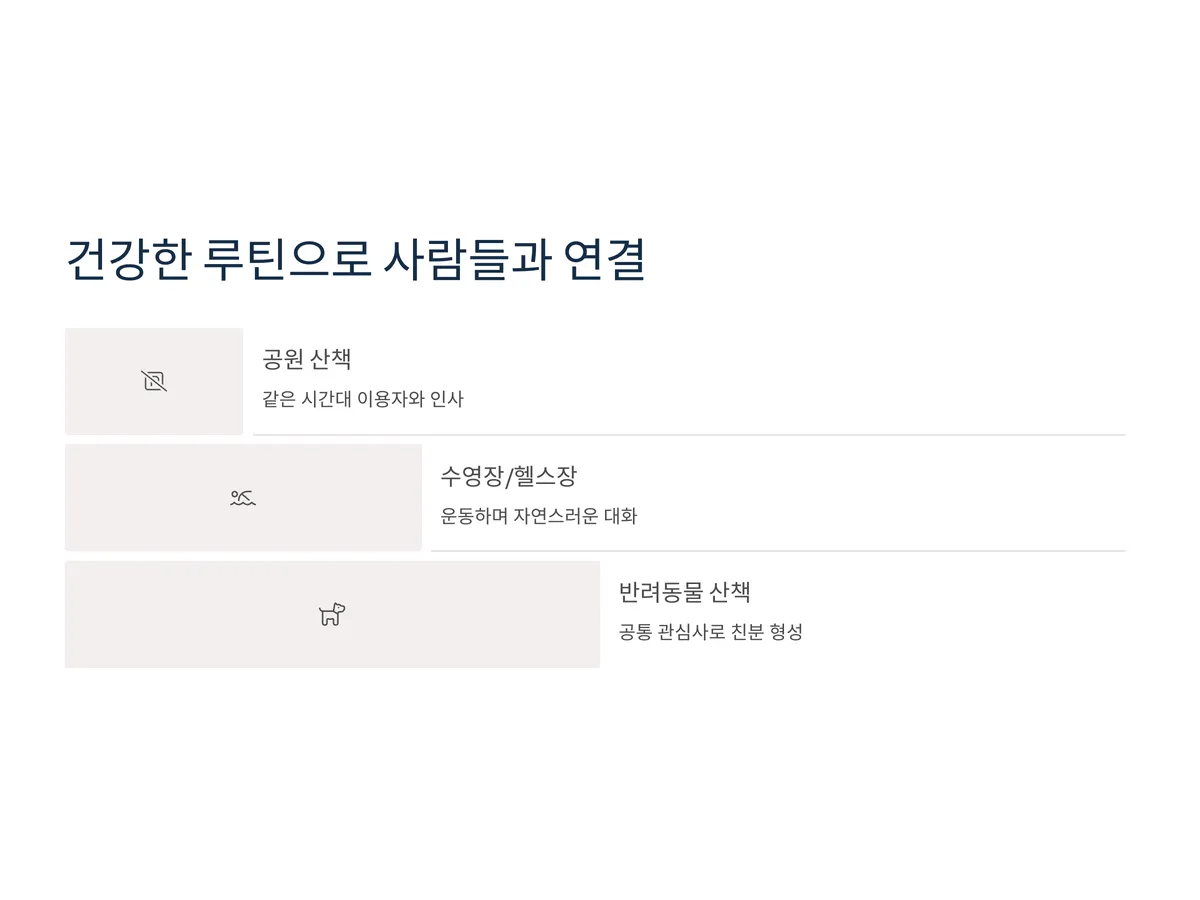 건강을 지키기 위한 일상 루틴을 잘 만들면 사람들과의 만남도 자연스럽게 따라옵니다. 예를 들어 매일 같은 시간에 공원을 산책하거나 헬스장, 수영장 등을 이용하면 비슷한 시간대에 운동하는 사람들과 얼굴을 익히게 되고, 간단한 인사에서부터 친분이 싹트는 경우가 많습니다. 특히 산책로에서 마주치는 반려동물 주인들 사이에는 자연스럽게 대화가 오가며 새로운 관계로 이어지곤 합니다.