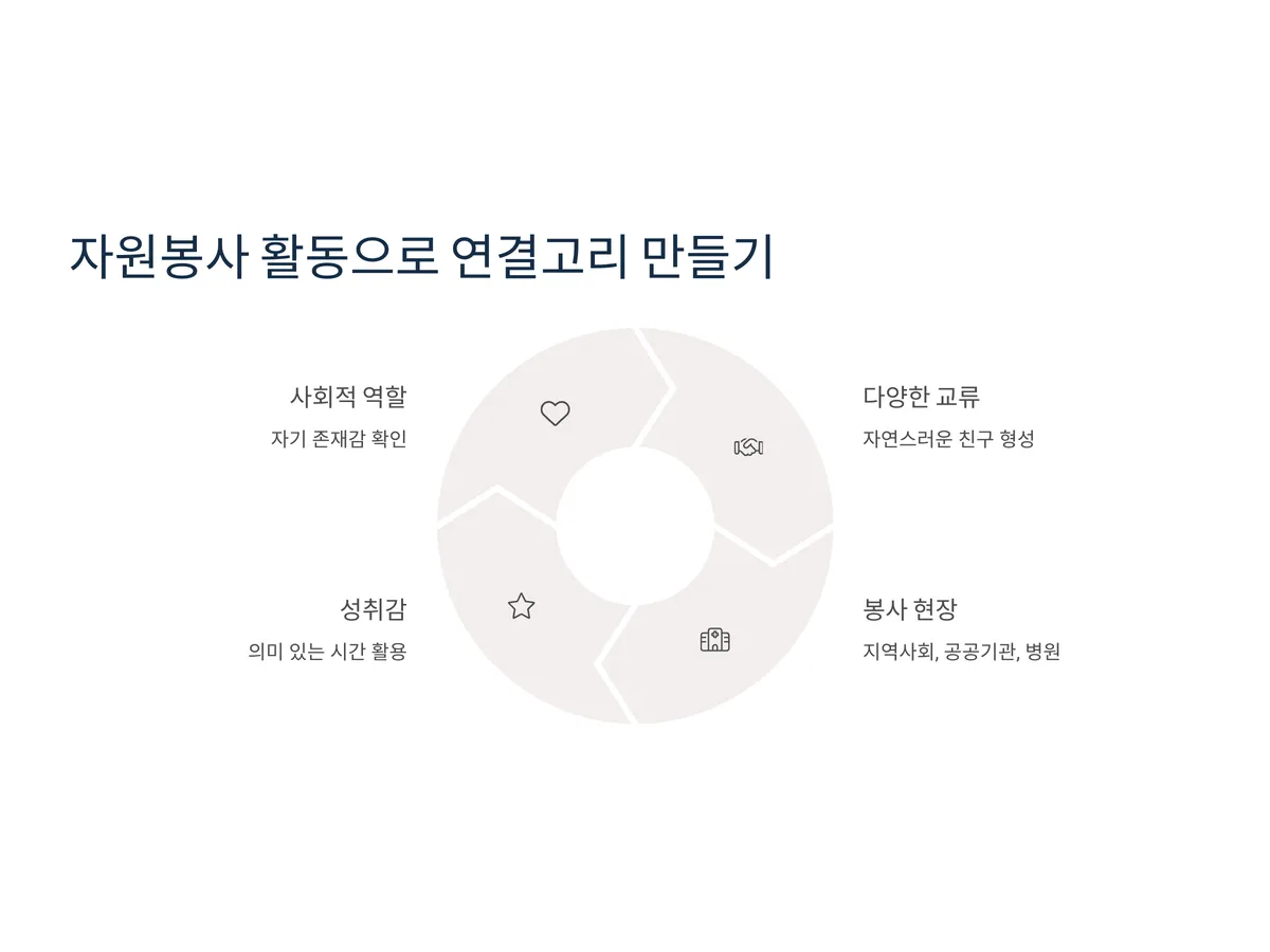 자원봉사는 남을 돕는 활동이지만, 실제로는 자신에게도 큰 보람과 성취감을 안겨주는 활동입니다. 특히 혼자 있는 시간이 많아지는 노년기에는 자원봉사를 통해 사회적 역할을 경험하며 자기 존재감을 재확인할 수 있습니다. 더불어 봉사 현장에서 다양한 사람들과 교류하며 자연스럽게 친구가 생기는 장점도 있습니다.