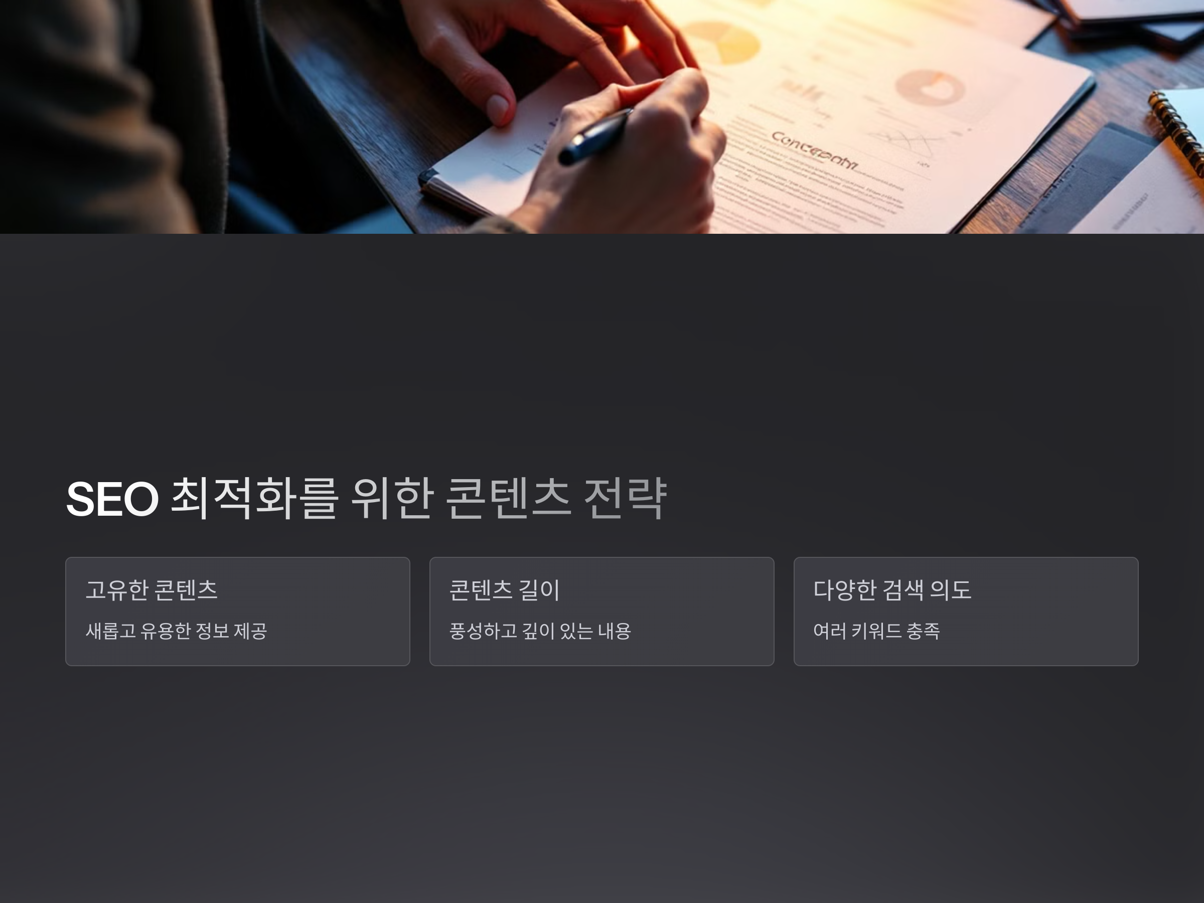 SEO 최적화에서 중요한 또 다른 전략은 고유하고 유익한 콘텐츠 작성입니다. 이미 존재하는 정보만 반복하는 것보다는, 새롭고 유용한 정보를 제공하는 것이 더 중요합니다. 구글은 원본 콘텐츠를 더 선호하며, 같은 주제를 다루더라도 다른 관점이나 추가적인 정보로 차별화된 콘텐츠를 제공하는 것이 효과적입니다.