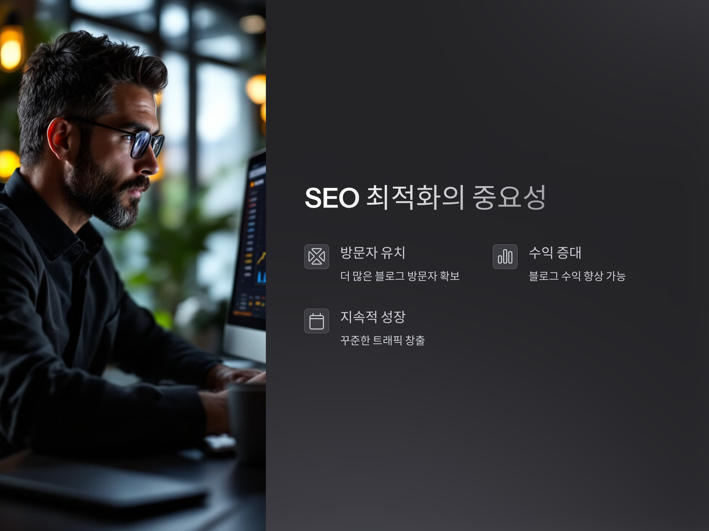 블로그를 시작하고 성장시키는 데 있어 가장 중요한 요소 중 하나는 바로 SEO 최적화입니다. 많은 블로거들이 이 부분을 간과하지만, 올바른 SEO 전략을 통해 블로그의 방문자 수를 급격하게 증가시킬 수 있습니다. 이번 포스트에서는 SEO 최적화를 위한 효과적인 방법과 구체적인 전략을 공유하며, 이를 통해 놀라운 결과를 얻을 수 있는 방법을 알려드리겠습니다. SEO의 핵심 요소들을 이해하고 적용하는 것이 얼마나 중요한지, 그리고 그것이 여러분의 블로그 성장에 어떤 영향을 미치는지 살펴보겠습니다.
