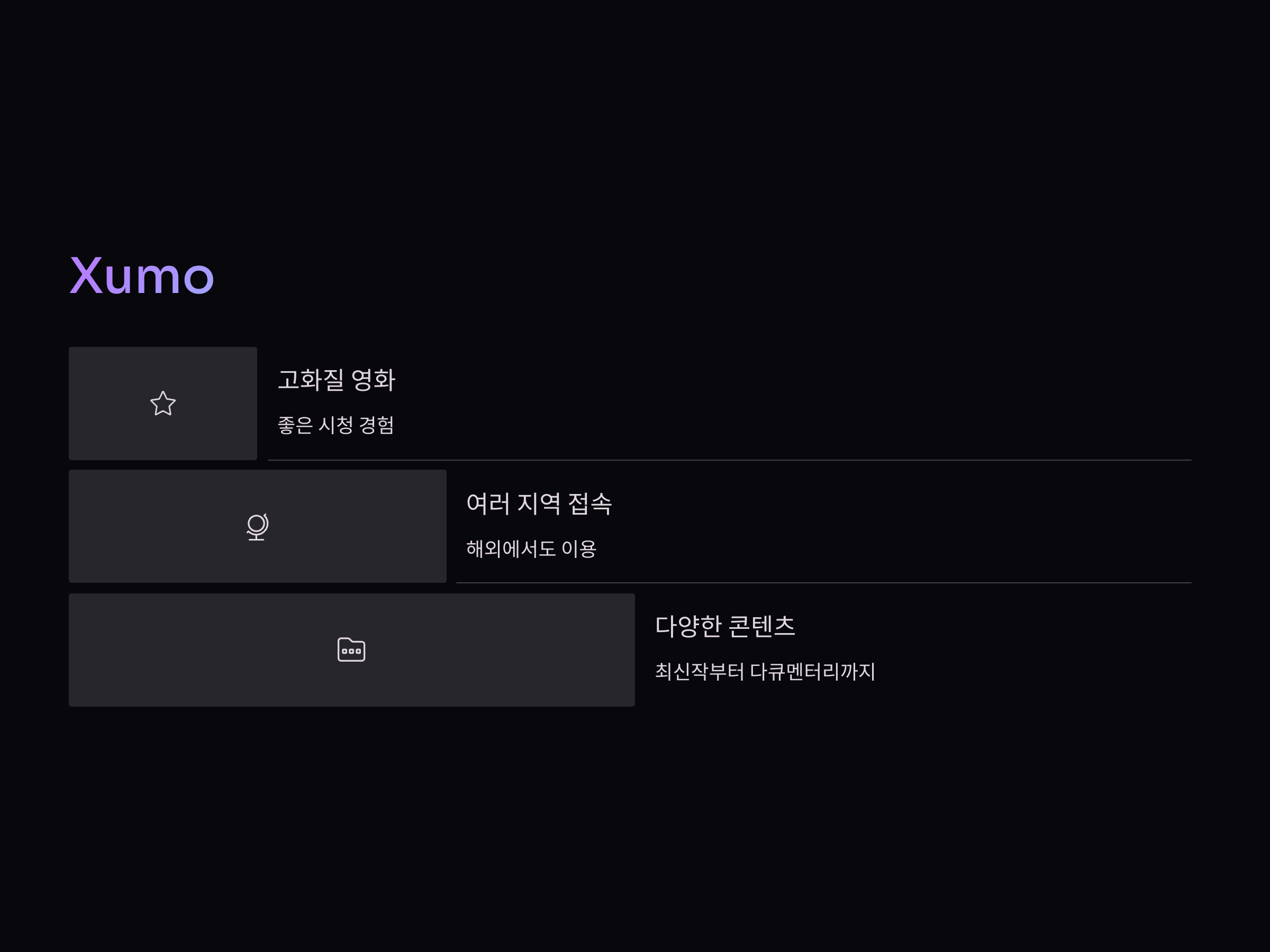 Xumo는 다양한 영화와 TV 프로그램을 무료로 제공하는 서비스입니다. 이 서비스는 특히 다양한 장르의 콘텐츠를 쉽게 즐길 수 있도록 해주며, 고화질의 영화를 제공하기 때문에 시청 경험이 좋습니다. Xumo는 광고 기반의 무료 서비스로, 사용자는 이 서비스를 통해 최신 영화부터 다큐멘터리까지 다양한 콘텐츠를 시청할 수 있습니다. 또한, Xumo는 여러 지역에서 사용 가능하므로 해외에서도 접속할 수 있는 장점이 있습니다.