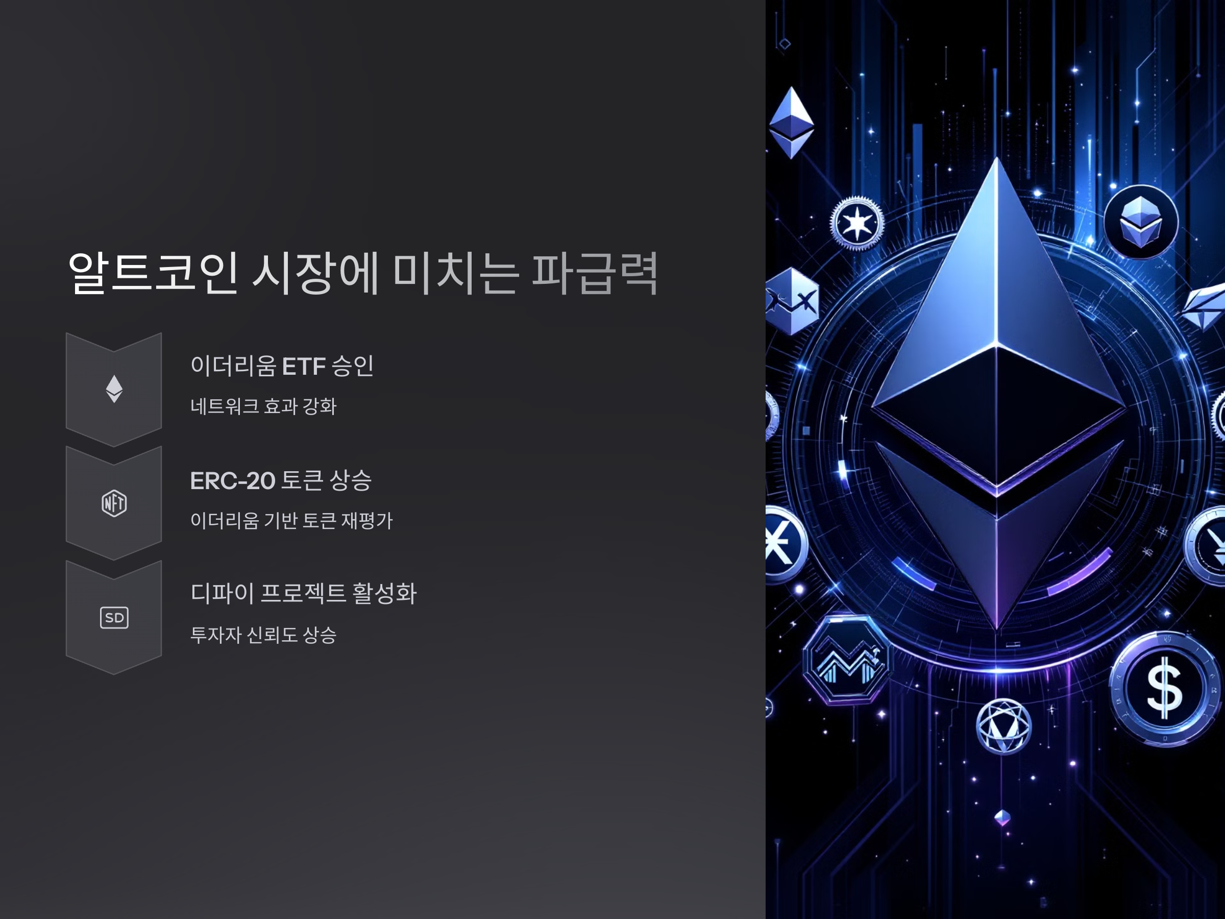 이더리움 ETF의 등장은 단순히 ETH 가격에만 영향을 주는 것이 아닙니다. 전체 알트코인 시장, 특히 이더리움 기반의 ERC-20 토큰들과 디파이(DeFi) 프로젝트들에 긍정적인 자극을 줄 수 있습니다. 이는 이더리움의 네트워크 효과가 강화되며 관련 프로젝트에 대한 투자자 신뢰도도 동반 상승하기 때문입니다.
