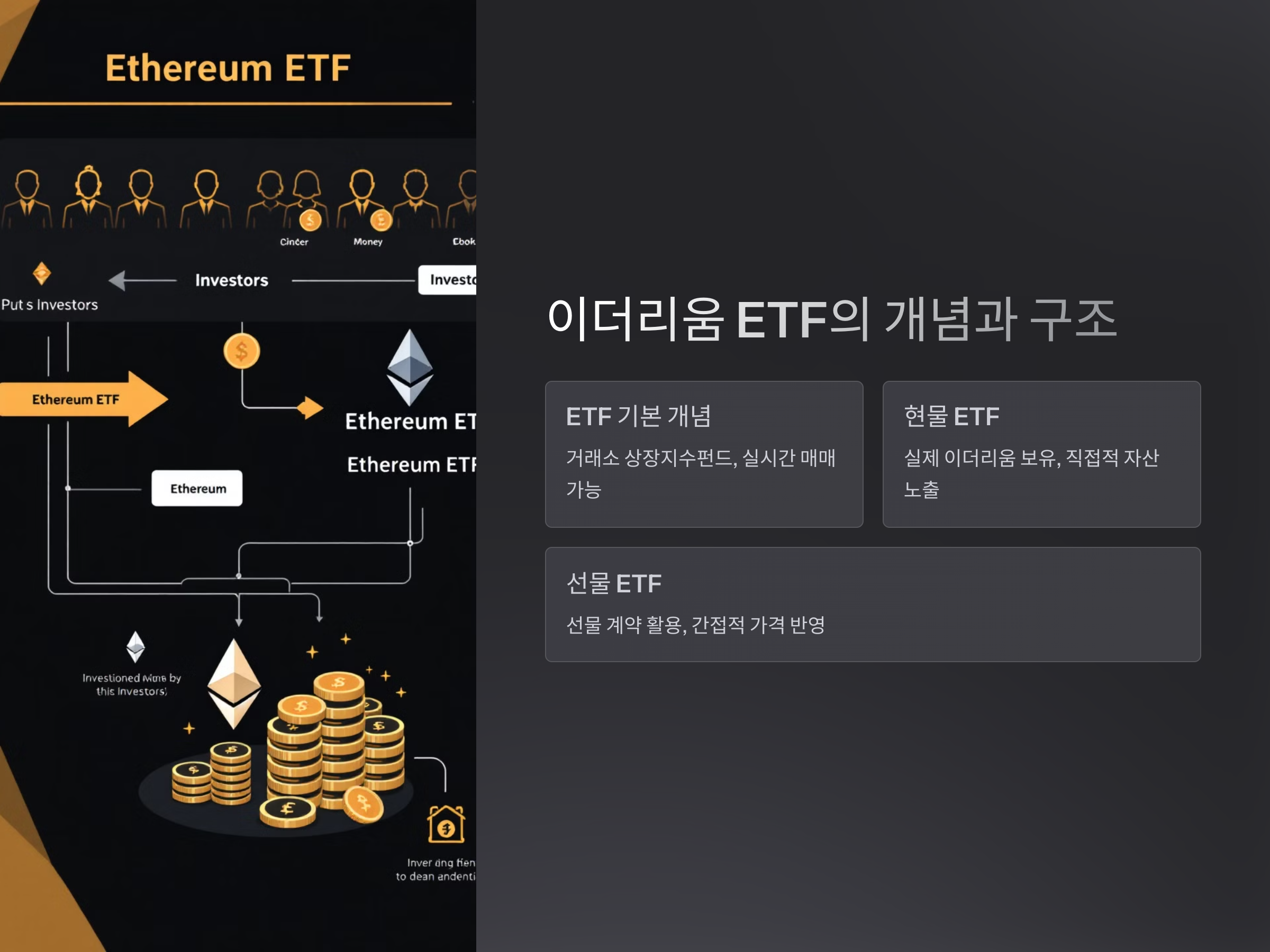 이더리움 ETF는 'Exchange Traded Fund', 즉 거래소 상장지수펀드의 한 종류로, 이더리움이라는 디지털 자산의 가격을 추종하는 금융상품입니다. ETF는 일반적으로 주식처럼 실시간으로 매매할 수 있으며, 펀드에 직접 투자하지 않고도 간접적으로 해당 자산에 노출될 수 있게 해줍니다. 이더리움 ETF는 기본적으로 이더리움 현물(실제 ETH 토큰)을 직접 보유하거나 선물 계약을 통해 가격을 추종하게 됩니다.
