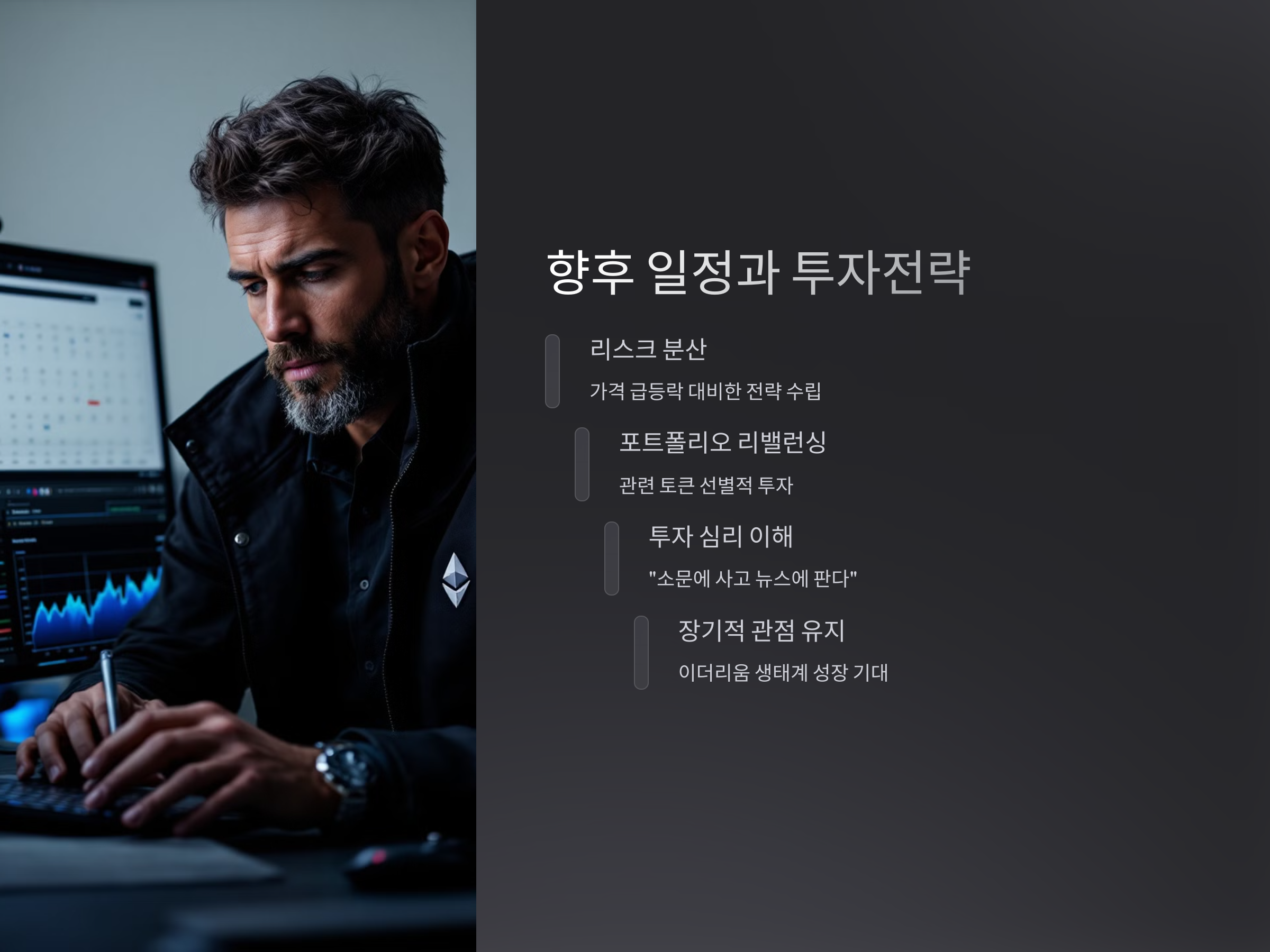 특히 승인 전에는 기대감에 의한 가격 상승이 나타날 수 있으며, 승인 후 단기 차익 실현 매물이 출회될 가능성도 염두에 둬야 합니다. 따라서 시기별로 분산 매수를 하거나, ETF 승인과 무관하게 이더리움 생태계에 대한 장기적인 확신을 기반으로 한 투자 전략이 더 유리할 수 있습니다. 정보의 흐름을 꾸준히 확인하고, 각종 뉴스와 정책 변화에 즉각적으로 반응할 수 있는 민첩함이 요구되는 시점입니