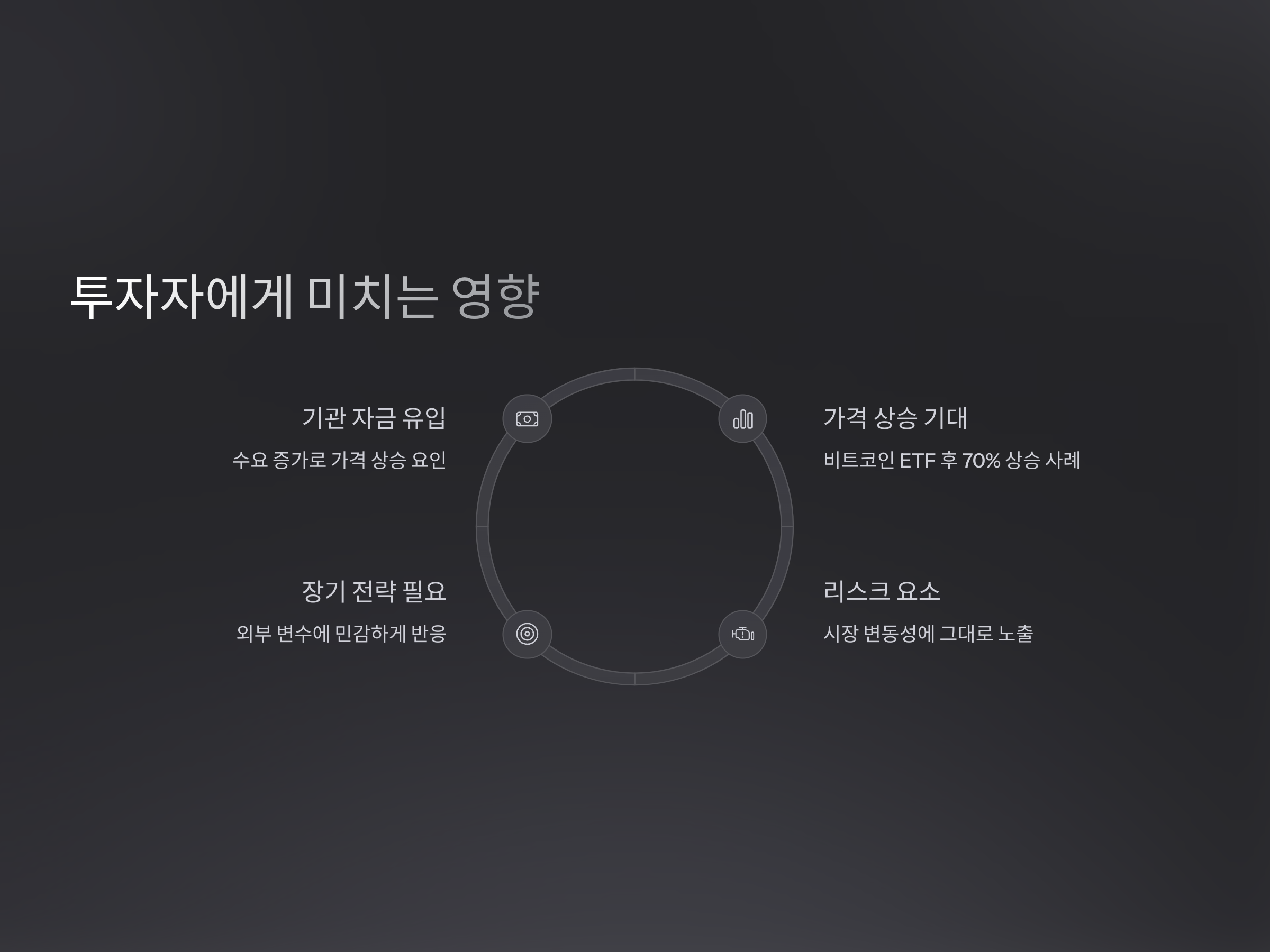 이더리움 ETF가 승인되면 가장 큰 변화는 바로 ‘기관 자금의 유입’입니다. 기존에는 디지털 자산에 투자하고 싶어도 법적 규제나 내부 정책상 제약이 많았던 기관들이 ETF라는 포맷을 통해 자유롭게 이더리움에 접근할 수 있게 됩니다. 이는 자연스럽게 수요 증가를 불러일으키며, 가격 상승 요인으로 작용할 수 있습니다. 실제로 비트코인 현물 ETF 승인 이후 비트코인은 약 70% 상승했으며, 이더리움 역시 같은 경로를 밟을 것으로 기대됩니다.