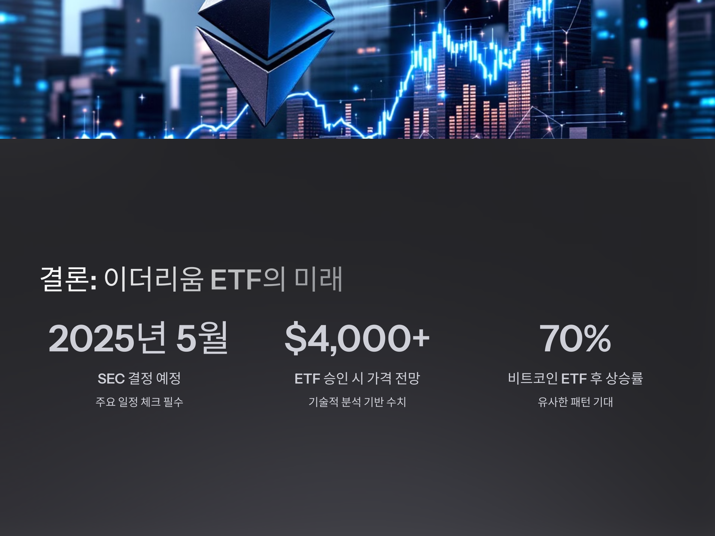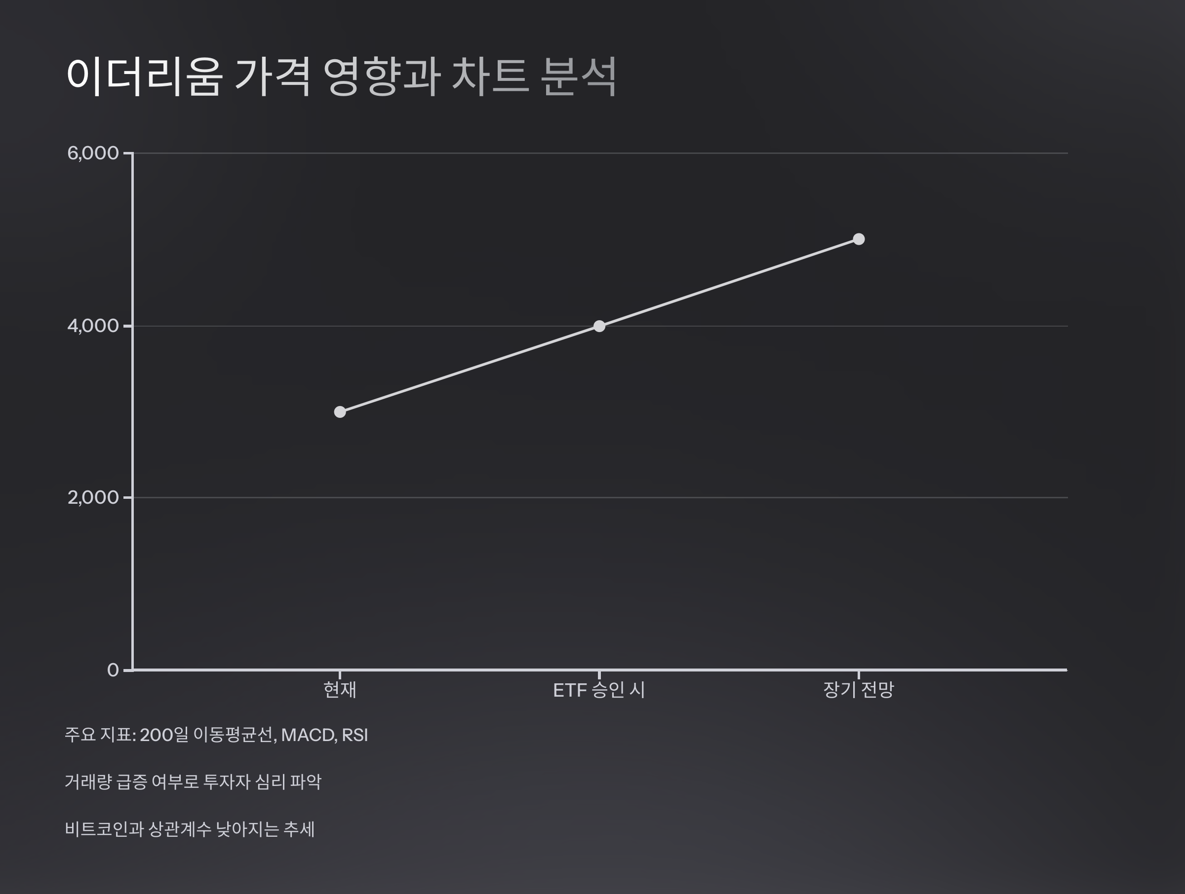 이더리움 ETF 승인 소식은 이미 가격에 일부 반영되고 있으며, 심리적 저항선과 기술적 지지선 간의 치열한 공방이 이어지고 있습니다. 특히 2025년 초, 이더리움은 $3,000선을 넘보는 흐름을 보여주었으며, ETF 승인 시에는 $4,000 이상까지도 무난히 도달할 수 있다는 전망이 나오고 있습니다. 이러한 예측은 단순한 기대가 아니라 기술적 분석을 기반으로 한 수치입니다.
