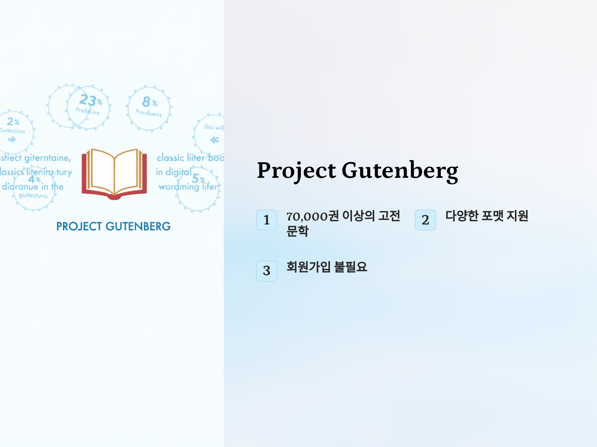 Project Gutenberg는 저작권이 만료된 고전 문학을 무료로 제공하는 세계 최초의 전자책 라이브러리입니다.