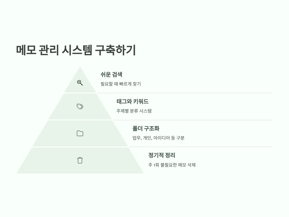 메모를 많이 한다고 해서 효율이 높은 건 아닙니다. 오히려 정리되지 않은 메모는 오히려 방해가 될 수 있습니다. 메모는 주제별로 폴더를 나누고, 태그나 키워드를 적극 활용해야만 검색과 복습이 쉬워집니다.