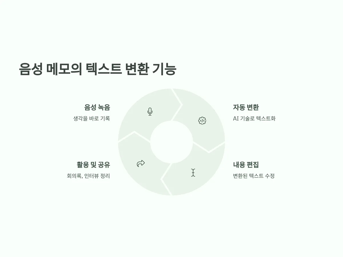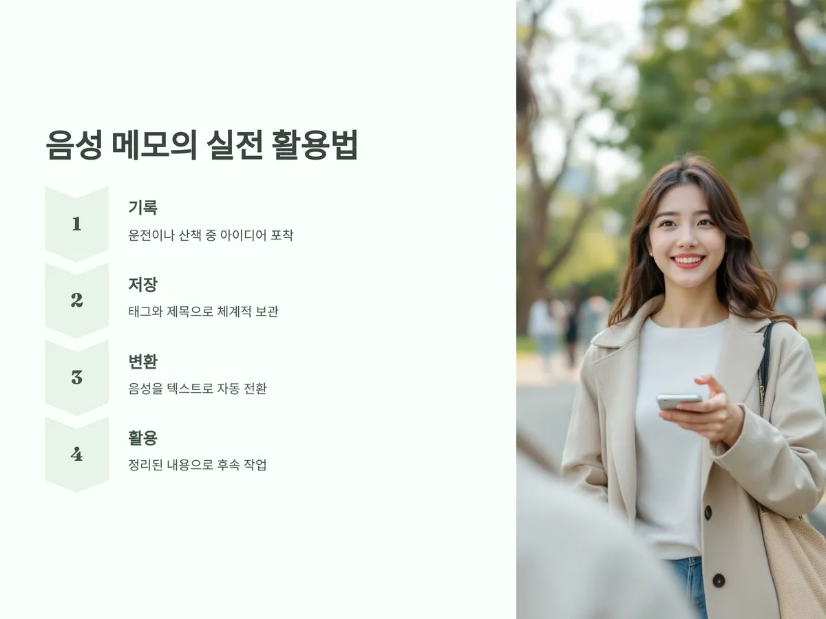 음성 메모를 녹음하는 것도 중요하지만, 이를 텍스트로 변환해 기록화하는 것은 더욱 중요합니다. 대부분의 최신 스마트폰은 음성을 텍스트로 변환하는 기능을 제공하고 있으며, 이 기능은 회의록 작성, 인터뷰 정리, 브레인스토밍 아이디어 정리에 매우 적합합니다.