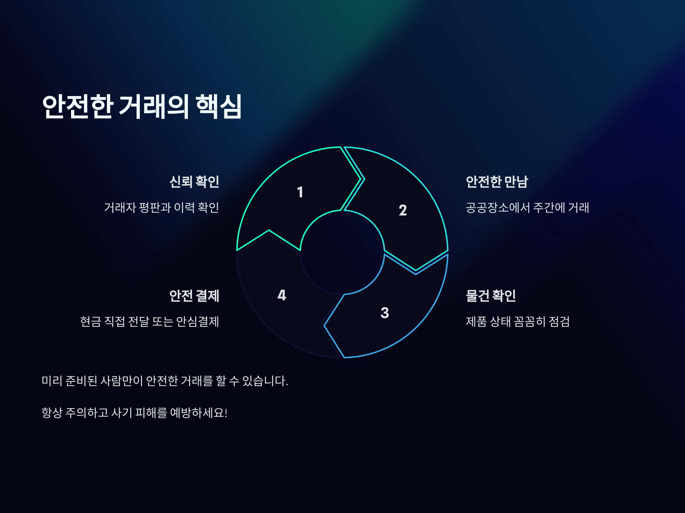 - 거래 시간 조정: 너무 이른 아침이나 늦은 밤에 거래를 하자고 유도하는 사람은 경계하는 것이 좋습니다. 거래 상대방이 시간을 임의로 조정하려 할 경우, 사기를 시도할 가능성이 있으므로 주의가 필요합니다.