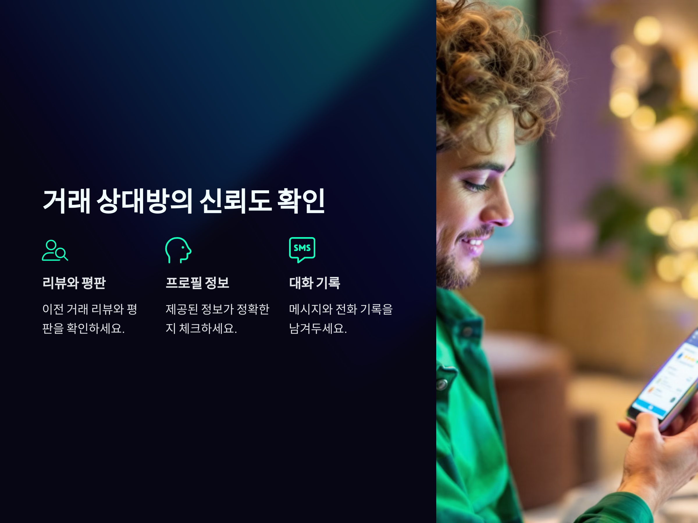 - 상대방의 리뷰와 평판 확인하기: 거래를 하기 전, 상대방의 이전 거래 리뷰와 평판을 확인하세요. 긍정적인 리뷰가 많은 상대방은 거래가 안전할 확률이 높습니다.