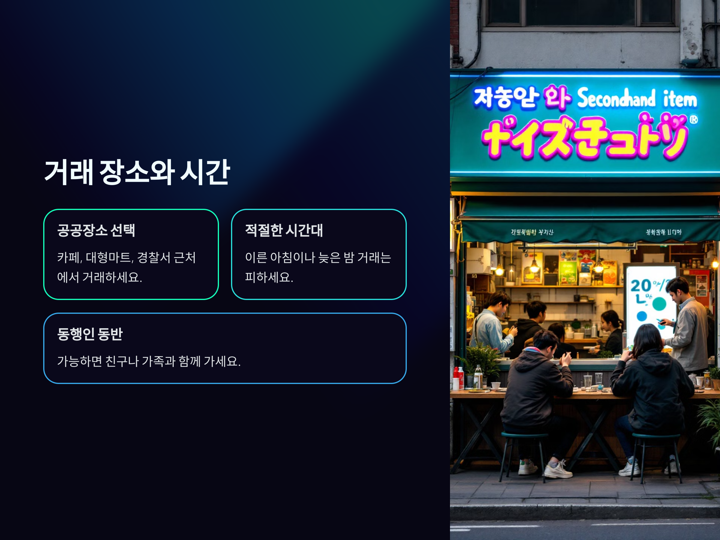 - 공공장소에서 거래하기: 거래는 항상 사람이 많이 다니는 공공장소에서 이루어져야 합니다. 카페나 대형 마트, 또는 경찰서 근처에서 거래를 진행하는 것이 좋습니다.