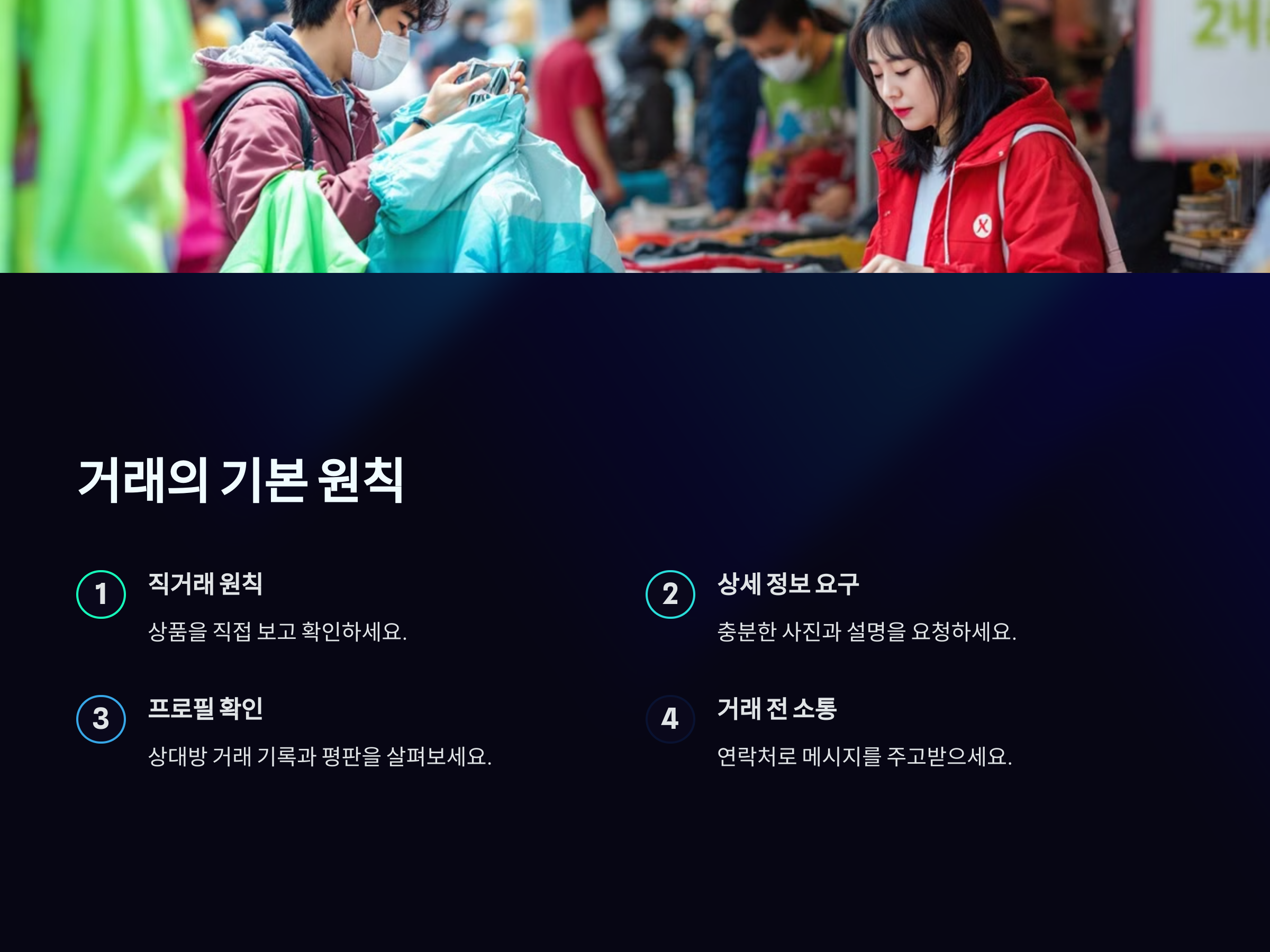 - 거래 후에는 바로 결제를 하지 마세요: 거래가 끝난 후, 상품을 실제로 받아본 뒤 결제를 진행하는 것이 가장 안전합니다. 상품을 보고 만족스러운 상태라면, 그때 결제를 하세요.