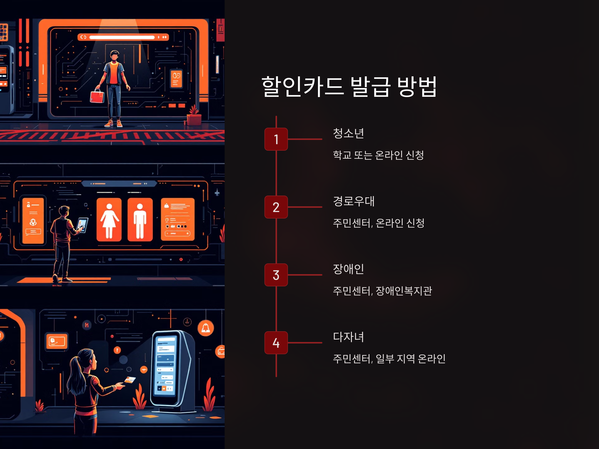 저소득층이나 기초생활수급자 등 사회복지 대상자에게는 대중교통을 할인받을 수 있는 특별한 혜택이 제공됩니다. 이 카드는 기초생활수급자나 차상위 계층을 대상으로 하며, 요금에서 최대 70%까지 할인이 가능합니다. 발급은 각 지역의 주민센터나 온라인을 통해 신청할 수 있습니다.