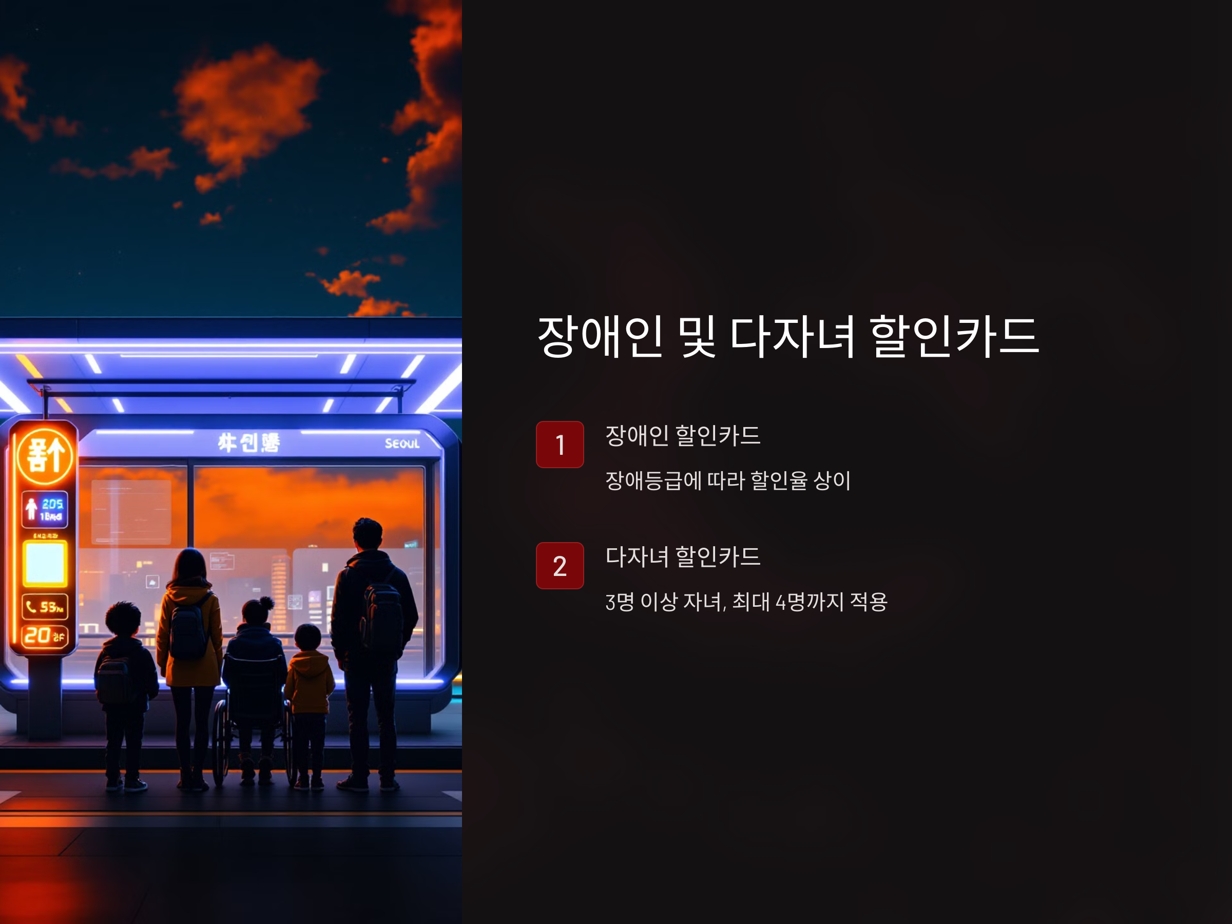 장애인 할인카드는 장애인 본인에게 제공되는 대중교통 할인 혜택입니다. 이 카드를 소지한 장애인은 버스와 지하철을 포함한 다양한 교통수단에서 할인 혜택을 받을 수 있습니다. 장애인 할인카드는 각 시청, 구청, 주민센터 등에서 발급받을 수 있으며, 장애등급에 따라 할인율이 다를 수 있습니다.