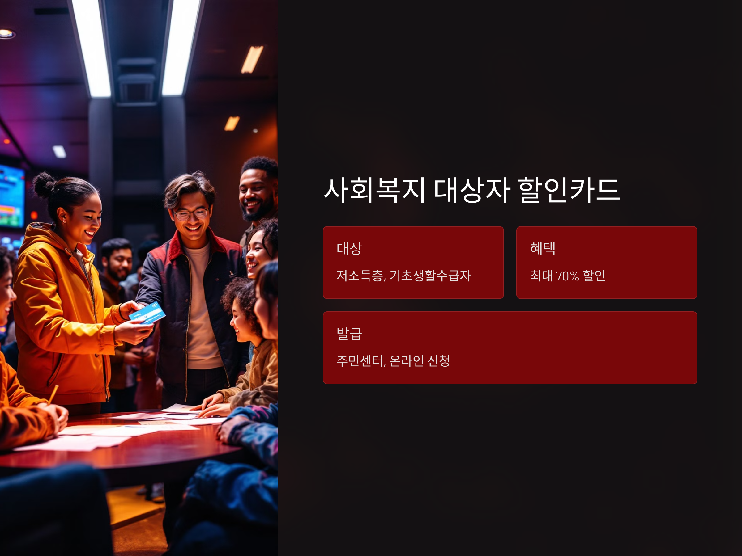 사회복지 대상자 할인카드는 기초생활수급자나 차상위 계층에게 제공됩니다. 발급을 위해서는 기초생활수급자 증명서나 차상위 계층을 증명할 수 있는 서류를 제출해야 하며, 이 카드는 각 지역 주민센터에서 발급받을 수 있습니다. 발급 후 할인 혜택을 누리며 대중교통을 이용할 수 있습니다.