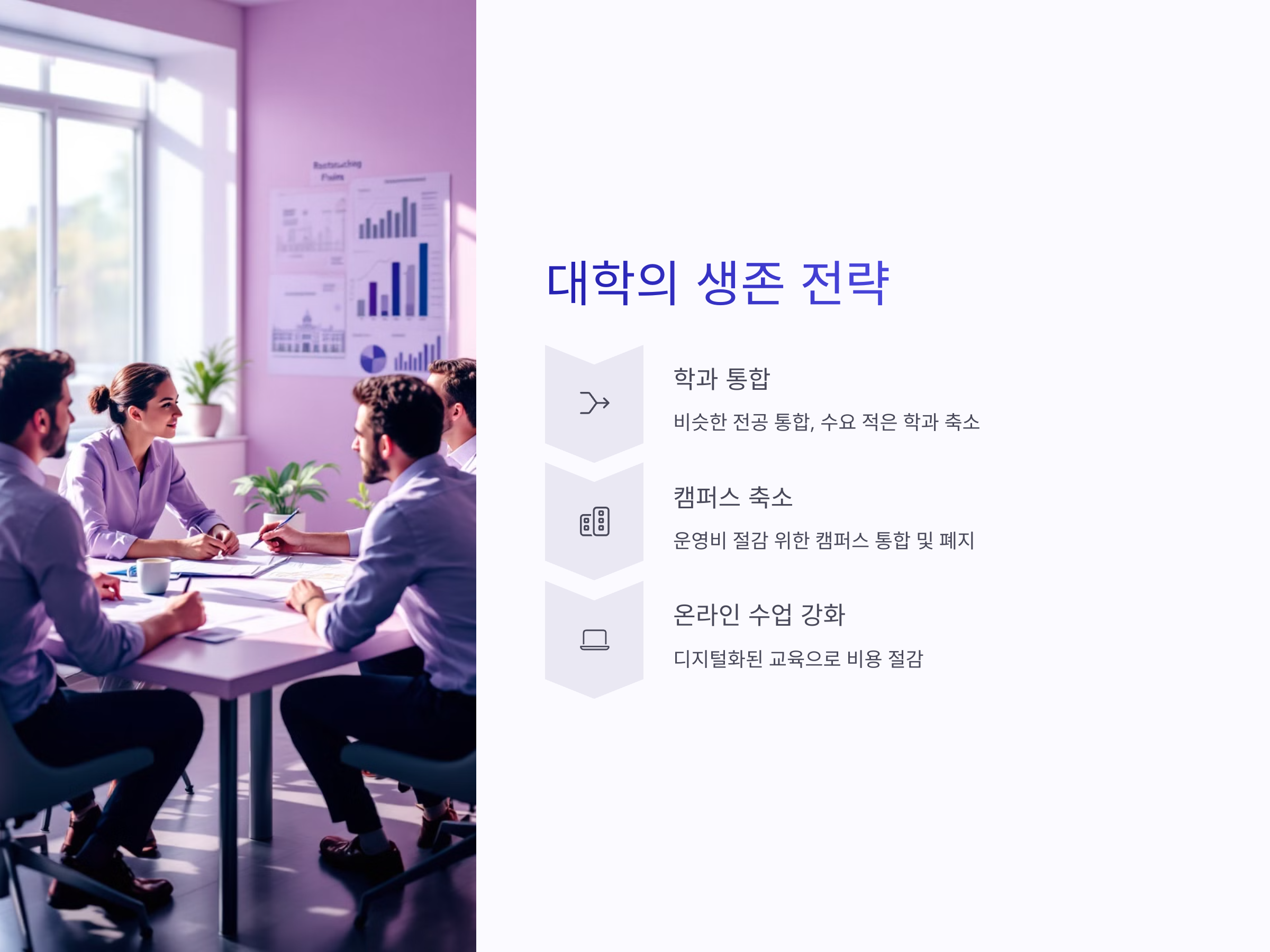 또 다른 전략은 '캠퍼스 축소'입니다. 학생 수 감소에 따라 일부 대학들은 캠퍼스를 통합하거나, 특정 지역 캠퍼스를 폐지하는 결정을 내리고 있습니다. 이는 운영비 절감과 효율성을 목표로 하지만, 해당 지역 사회나 학생들에는 큰 영향을 미칩니다. 캠퍼스가 폐지되면, 학생들의 통학 거리나 편의성에도 문제가 생길 수 있습니다.