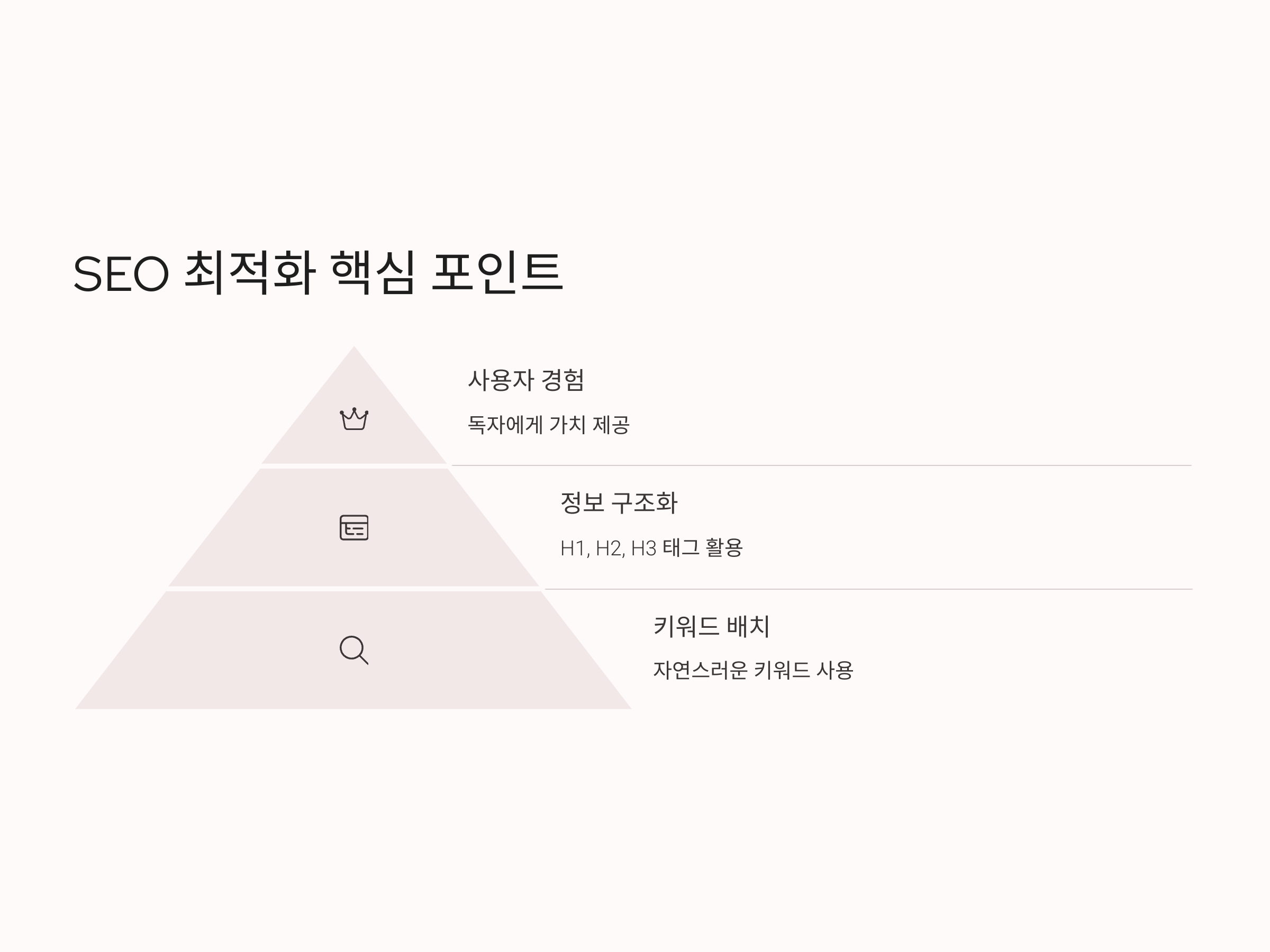 그 외에도 SEO를 고려하여 키워드 배치, 내부 링크 연결, 외부 링크 활용 등도 매우 중요한 부분입니다. 키워드를 어떻게 사용할지에 대한 전략도 중요하며, 너무 과도한 키워드 사용은 오히려 독자들에게 불편함을 줄 수 있다는 점을 기억해야 합니다.