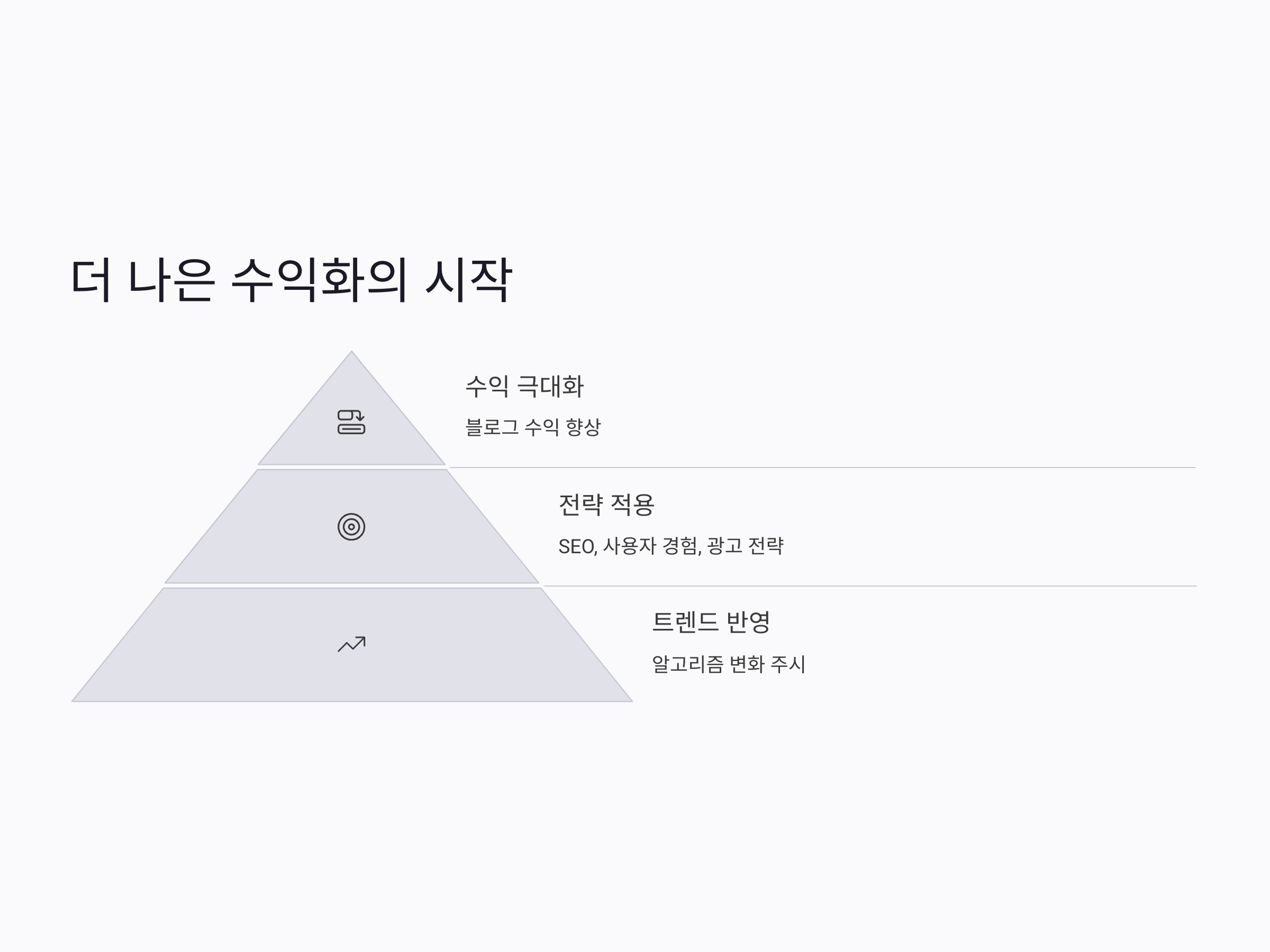 블로그 수익화를 극대화하기 위해서는 꾸준한 SEO 최적화, 사용자 경험 개선, 광고 배치 전략을 적용해야 합니다. 2025년의 블로그 트렌드와 함께 최신 전략을 반영한다면, 수익을 크게 향상시킬 수 있을 것입니다. 또한, 구글의 알고리즘 변화와 광고의 새로운 트렌드를 항상 주시하며, 변화에 맞춰 블로그 운영 방식을 유연하게 조정하는 것이 중요합니다.