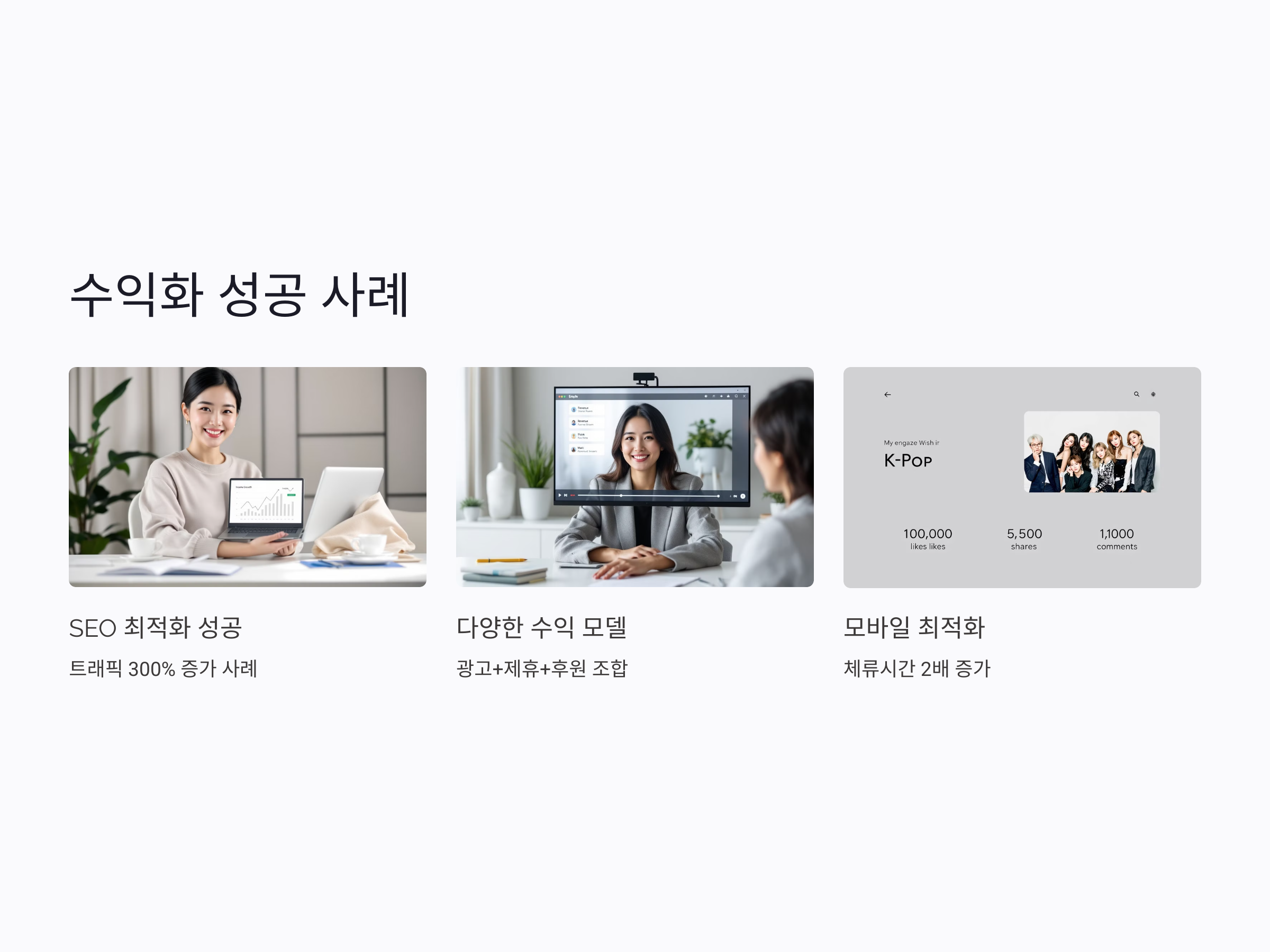 그리고 SEO 최적화뿐만 아니라 광고 수익화 방법에도 신경을 써야 합니다. 구글 애드센스를 활용한 광고 게재나 제휴 마케팅을 통해 수익을 올릴 수 있습니다. 클릭률(CTR)을 높이기 위한 광고 배치와 관련된 전략을 소개하고, 방문자가 광고를 클릭할 수 있도록 유도하는 방법을 설명하겠습니다.