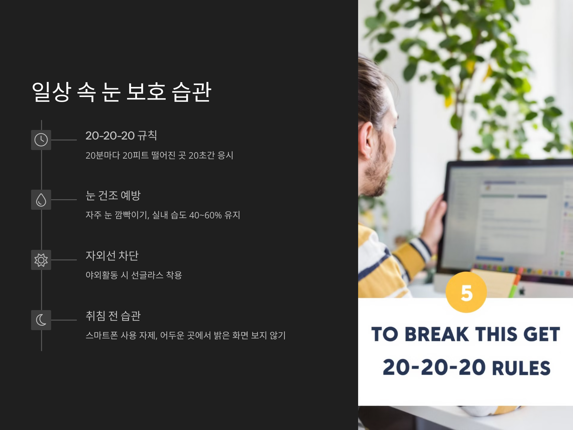 또한, 눈을 자주 깜빡여 눈물막을 유지하고 실내 습도는 40~60%로 유지하는 것이 좋습니다. 야외 활동 시에는 자외선 차단 기능이 있는 선글라스를 착용하여 자외선으로 인한 수정체 손상을 방지해야 합니다. 취침 전 스마트폰 사용을 자제하고, 어두운 곳에서 밝은 화면을 보는 습관을 피해야 합니다.