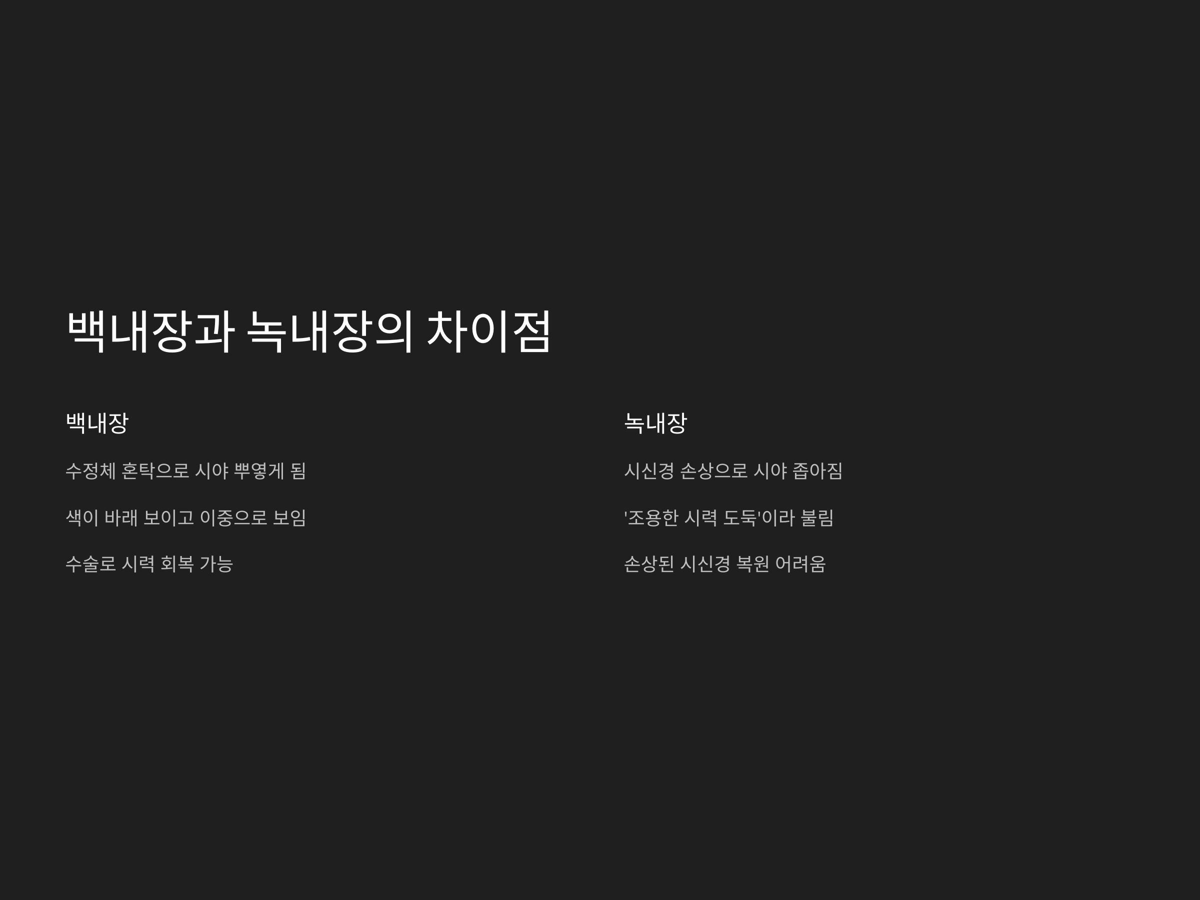두 질환 모두 초기 증상이 거의 없다는 공통점이 있으며, 정기적인 검진 없이는 발견이 늦어질 수 있습니다. 특히 녹내장은 ‘조용한 시력 도둑’이라는 별명이 있을 정도로 서서히 진행되기 때문에 예방과 조기 발견이 가장 중요합니다. 백내장은 수술로 시력을 회복할 수 있지만, 녹내장은 손상된 시신경을 복원하기 어렵기 때문에 평소 관리가 더욱 중요합니다.