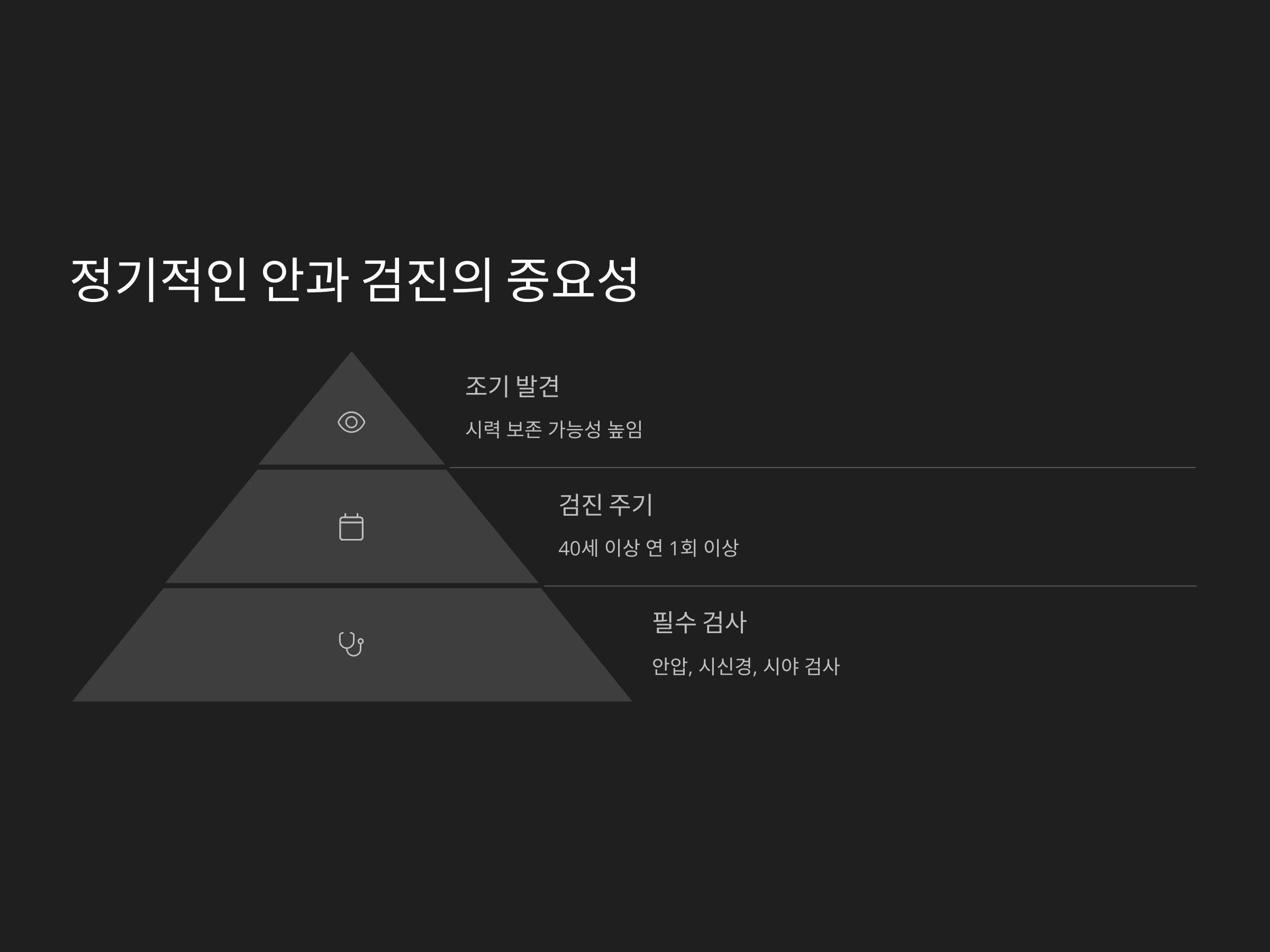 검진을 통해 수정체 혼탁이나 시신경 이상을 조기에 파악하면 치료 시기를 앞당겨 시력을 보존할 수 있습니다. 또한 가족력이 있는 경우 발병 위험이 높기 때문에 더욱 철저한 관리가 필요합니다. 건강보험공단에서도 2년에 한 번 안과 검진을 지원하고 있으니 이 제도를 적극 활용하는 것이 좋습니다.