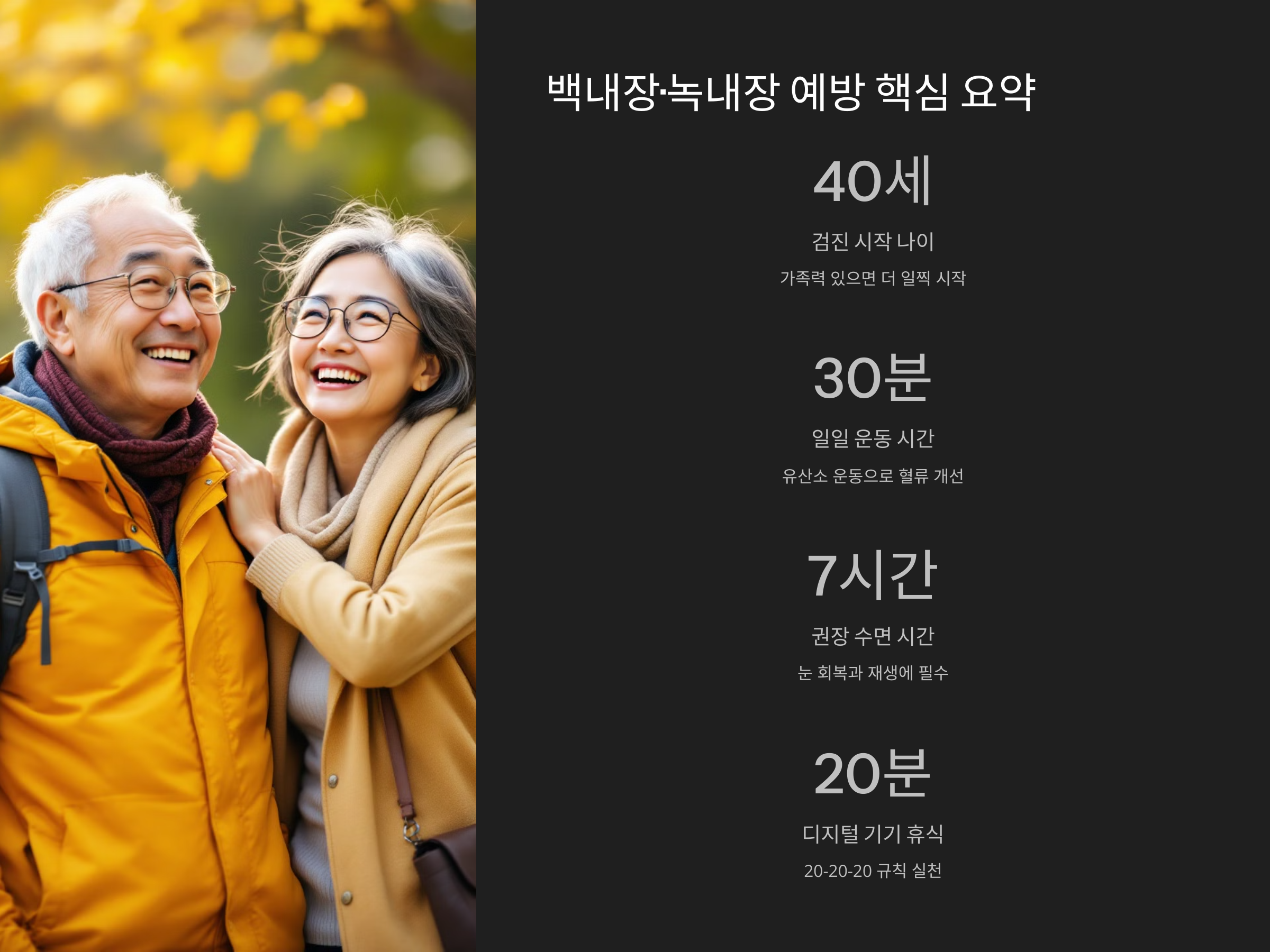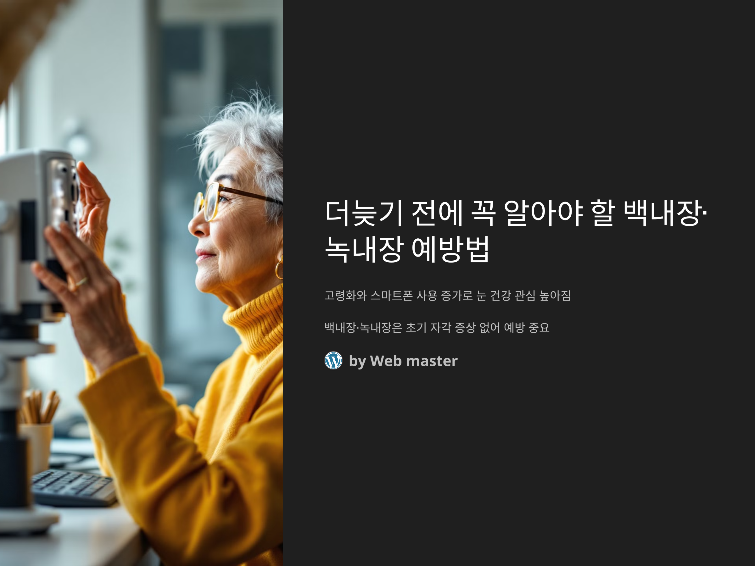 2024년 기준으로 건강보험심사평가원에 따르면 백내장 진단 건수는 400만 명을 넘었고, 녹내장 역시 100만 명 이상이 진단을 받고 있는 추세입니다. 특히 녹내장은 40대 이상 성인의 10명 중 1명꼴로 잠재적인 위험을 안고 있으며, 스마트폰이나 컴퓨터 화면을 장시간 바라보는 생활습관은 이러한 질환의 발병 연령을 앞당기는 주범이 되고 있습니다. 이를 예방하려면 단순한 시력검사뿐 아니라 식습관, 운동, 환경까지 포괄적인 눈 건강 관리가 필요합니다. 이 글에서는 백내장과 녹내장을 예방하고 눈 건강을 지키는 과학적이고 실천 가능한 방법을 자세히 소개합니다.