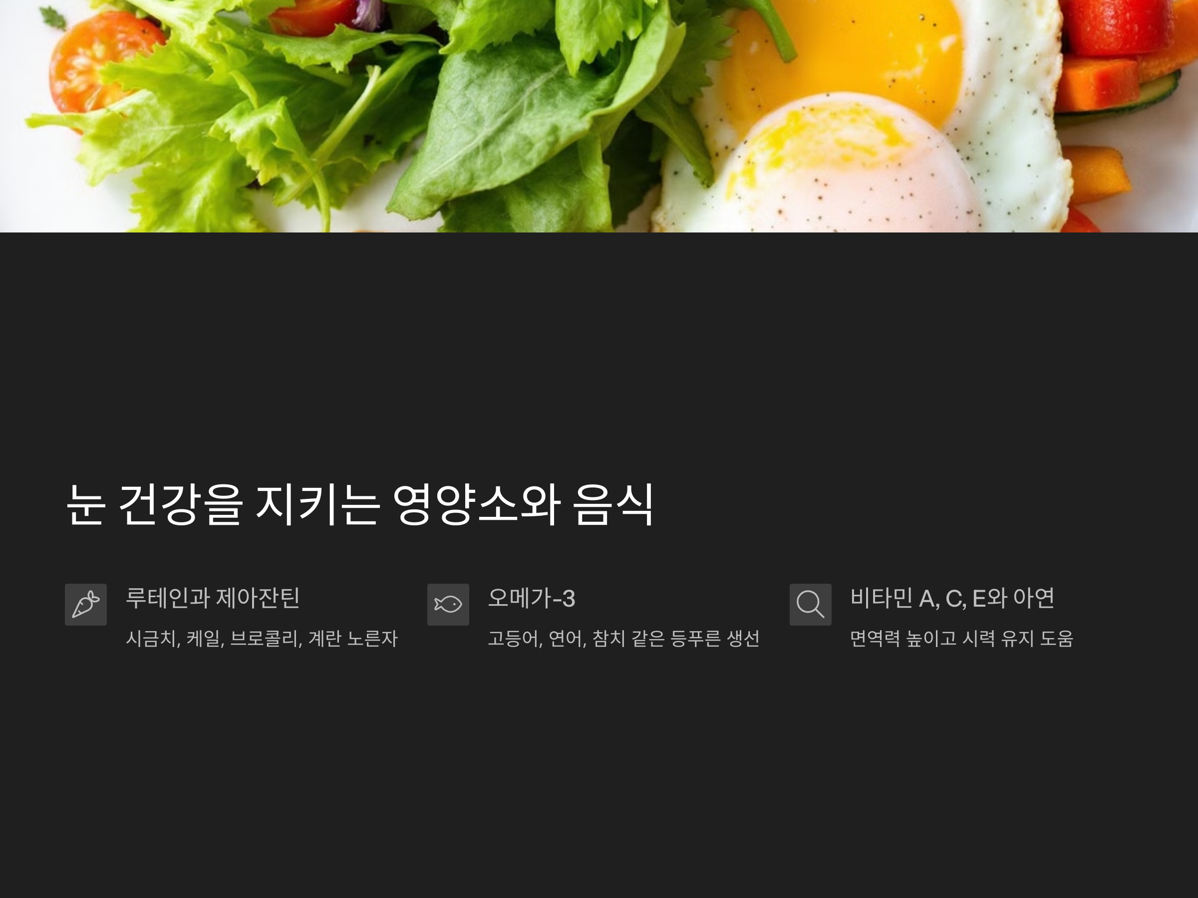 눈 건강을 지키기 위한 첫걸음은 올바른 식습관입니다. 특히 루테인, 제아잔틴, 오메가-3, 비타민 A, C, E, 아연 등이 풍부한 음식을 섭취하면 백내장과 녹내장 예방에 도움이 됩니다. 루테인과 제아잔틴은 망막과 수정체를 구성하는 성분으로 자외선과 블루라이트로부터 눈을 보호해 줍니다. 시금치, 케일, 브로콜리 같은 녹색 채소에 풍부하게 들어 있으며, 계란 노른자에도 함유돼 있습니다.