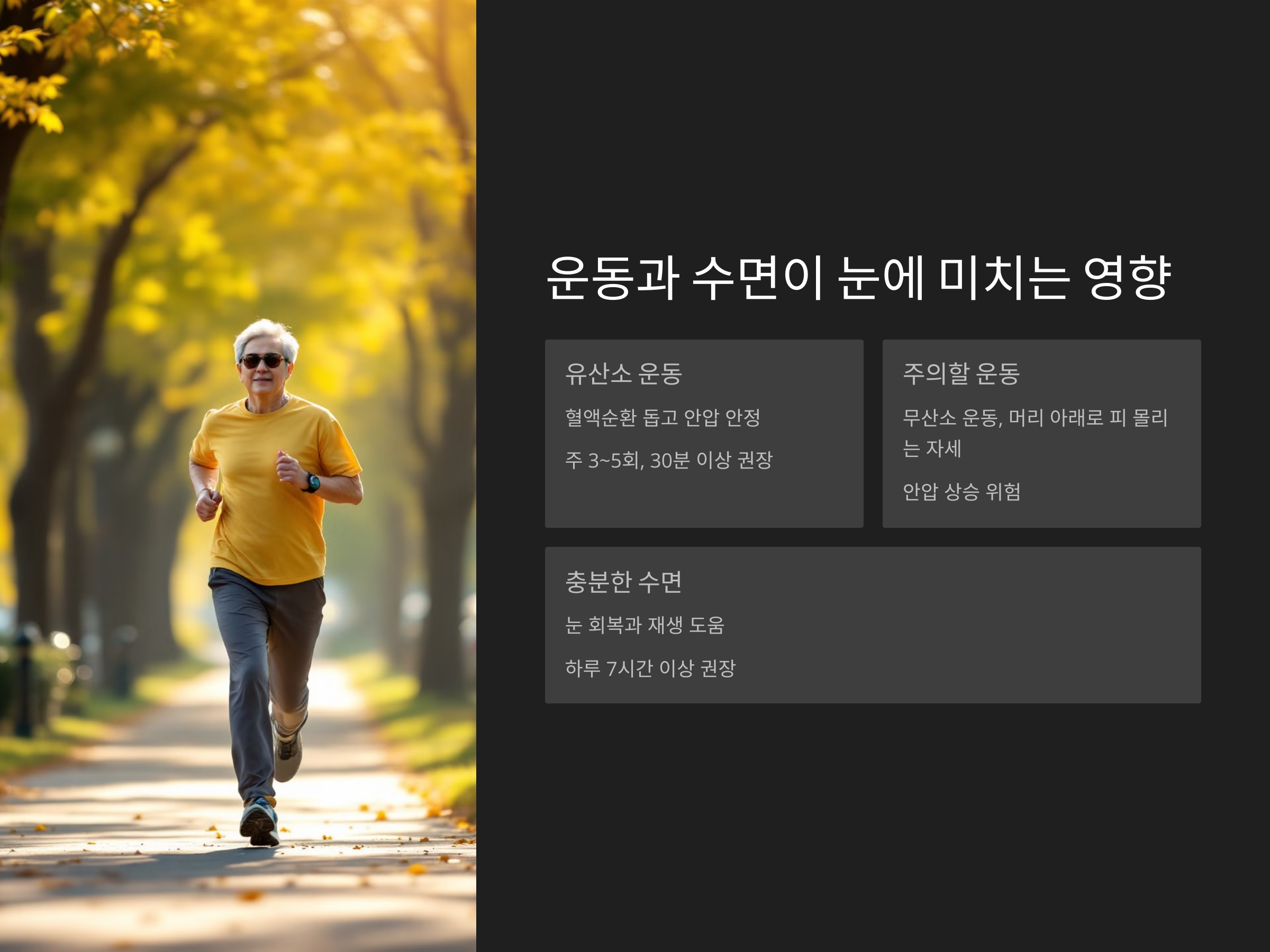규칙적인 운동은 전신의 혈액순환을 돕고 안압을 안정시켜 녹내장 예방에 도움이 됩니다. 특히 유산소 운동은 눈으로 가는 혈류를 원활하게 해주며, 일주일에 3~5회, 30분 이상 꾸준히 하는 것이 좋습니다. 반대로 무거운 물건을 드는 무산소 운동이나 머리 아래로 피가 몰리는 자세는 안압을 올릴 수 있으므로 주의해야 합니다.