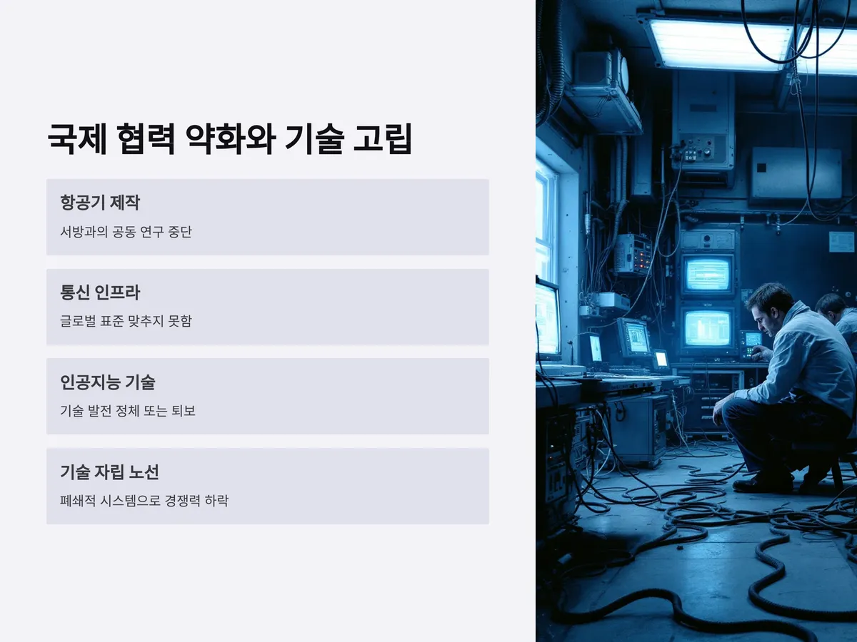 서방 국가뿐만 아니라, 중립적 태도를 유지하던 국가들마저 러시아와의 기술 협력을 중단하면서 러시아의 과학 및 산업 기술력은 정체 또는 퇴보의 길을 걷고 있습니다. 특히 항공기 제작, 통신 인프라, 인공지능 기술 분야에서 서방과의 공동 연구가 중단되며 러시아 내 기술 고립 현상이 가속화되고 있습니다.