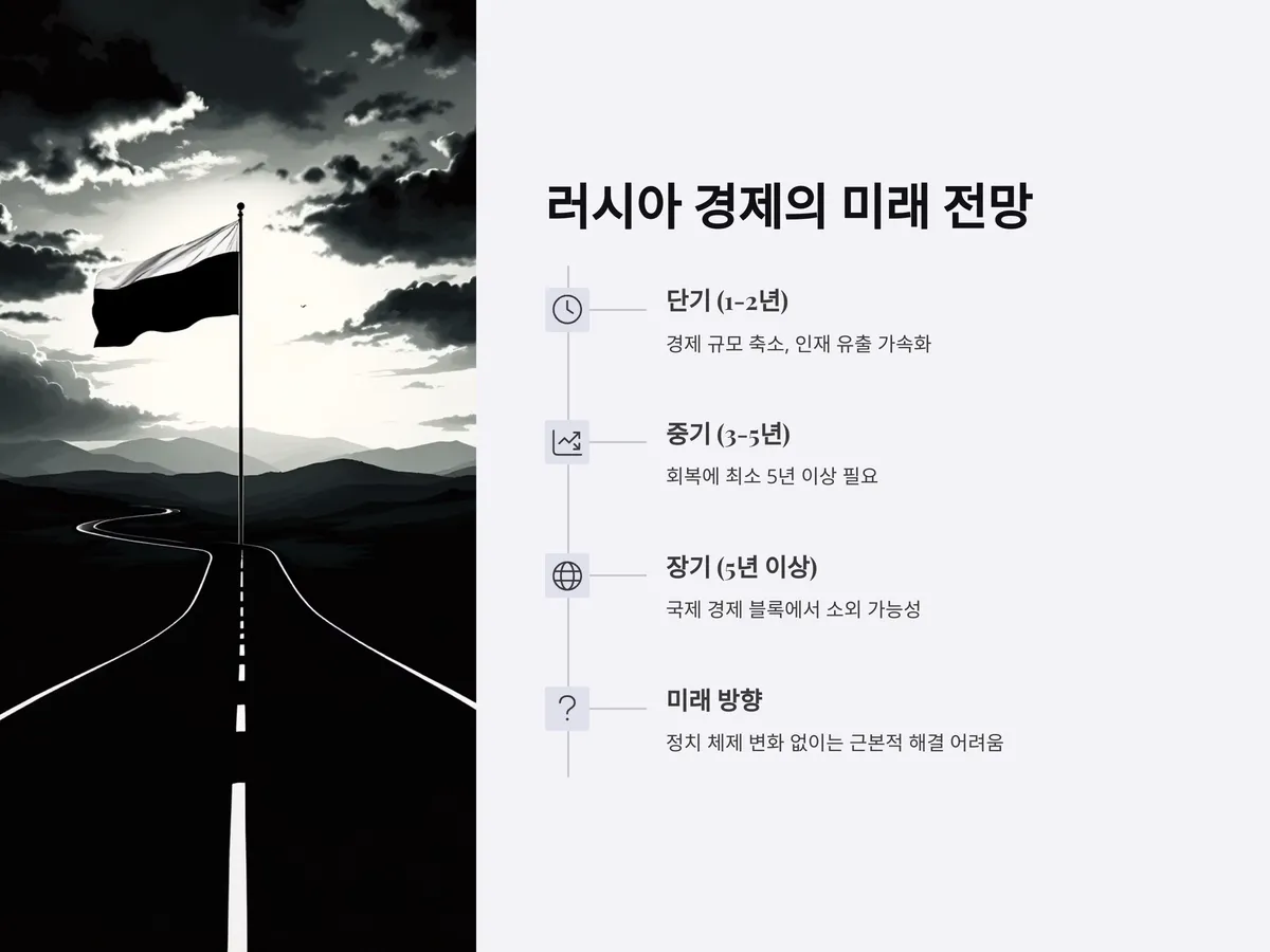 경제 전문가들은 러시아가 제재에서 회복되기 위해선 최소 5년 이상의 시간이 필요하며, 정치 체제 변화 없이는 근본적인 해결이 어렵다고 전망합니다. 현재의 방향성으로는 경제 규모 자체가 축소될 가능성이 크며, ‘지속 가능한 성장을 위한 구조 개혁’은커녕, 국제 사회의 경제 블록에서 완전히 소외될 수도 있다는 우려가 나오고 있습니다.