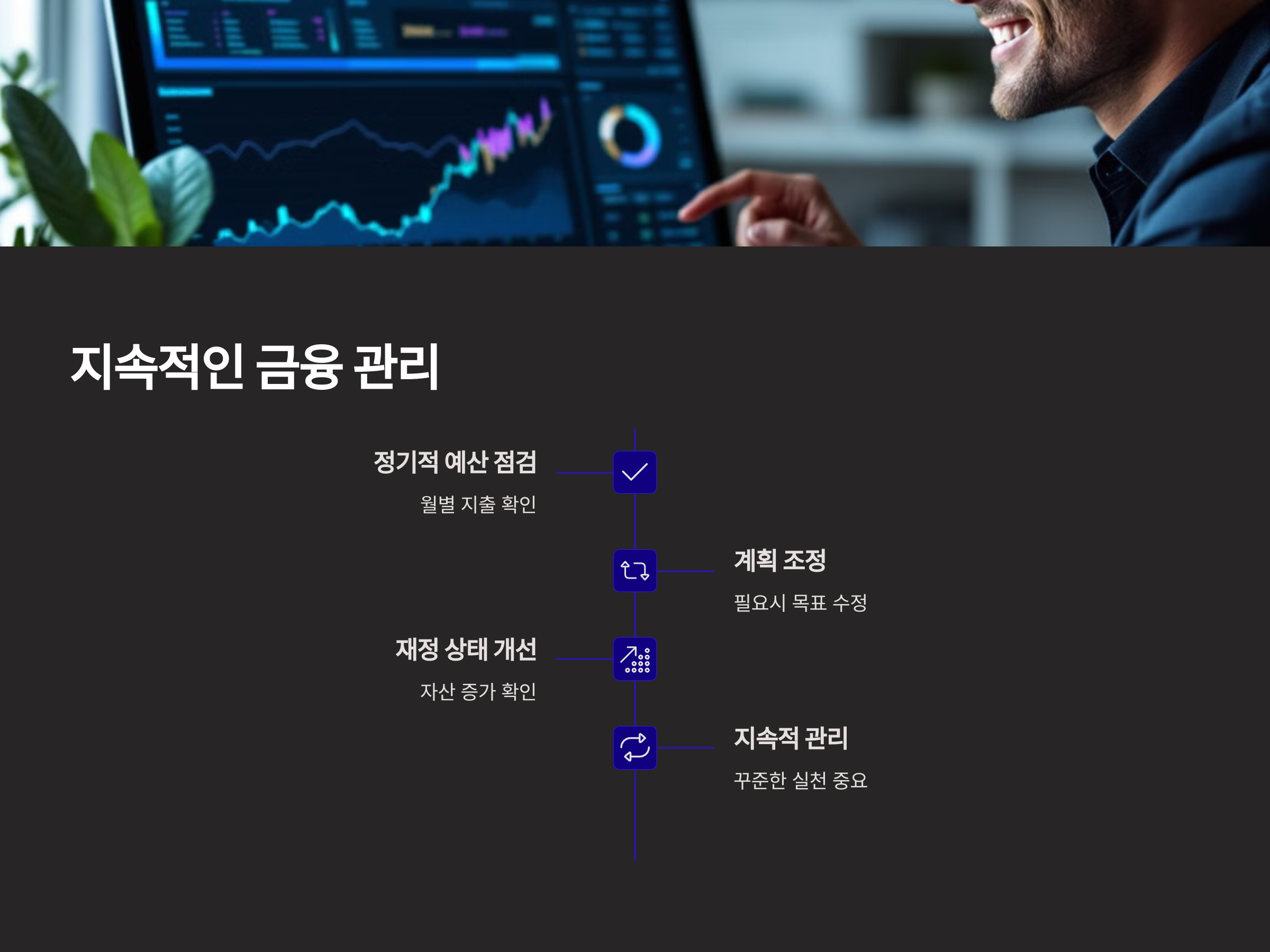 금융 관리는 단기적인 절약에서 끝나는 것이 아니라, 지속적으로 관리해야 하는 과정입니다. 한 번의 노력으로 모든 것을 해결할 수 없으며, 시간이 지남에 따라 계획을 수정하고 조정하는 과정이 필요합니다. 꾸준한 금융 관리와 개선을 통해 더 나은 재정 상태를 유지할 수 있습니다.