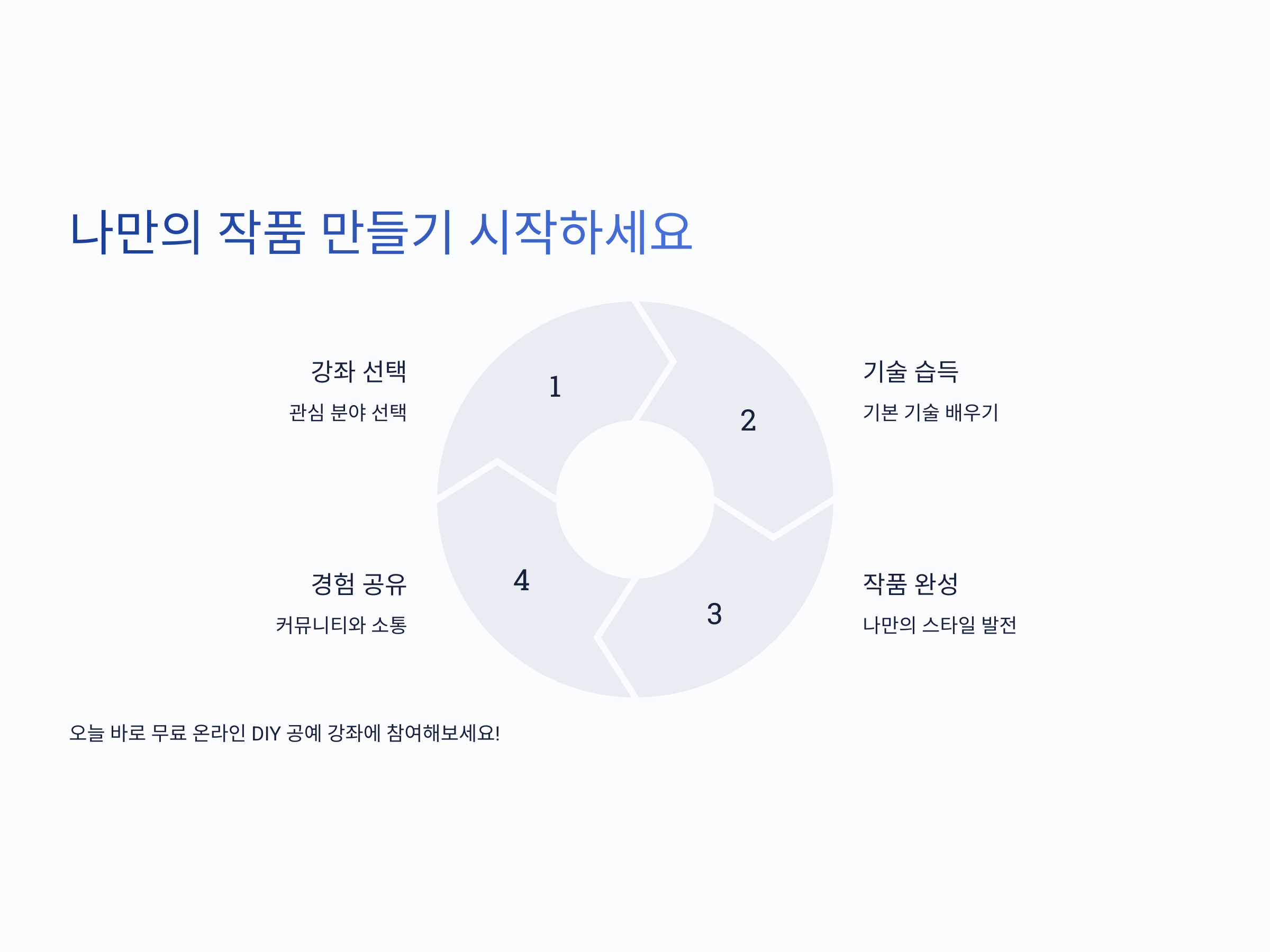 온라인에서 제공되는 다양한 공예 강좌에 참여해보세요. 각자의 수준과 관심사에 맞는 강좌를 찾을 수 있으며, 모든 강좌가 무료로 제공되기 때문에 부담 없이 시작할 수 있습니다. 오늘 바로 무료 온라인 DIY 공예 강좌에 참여해보세요!
