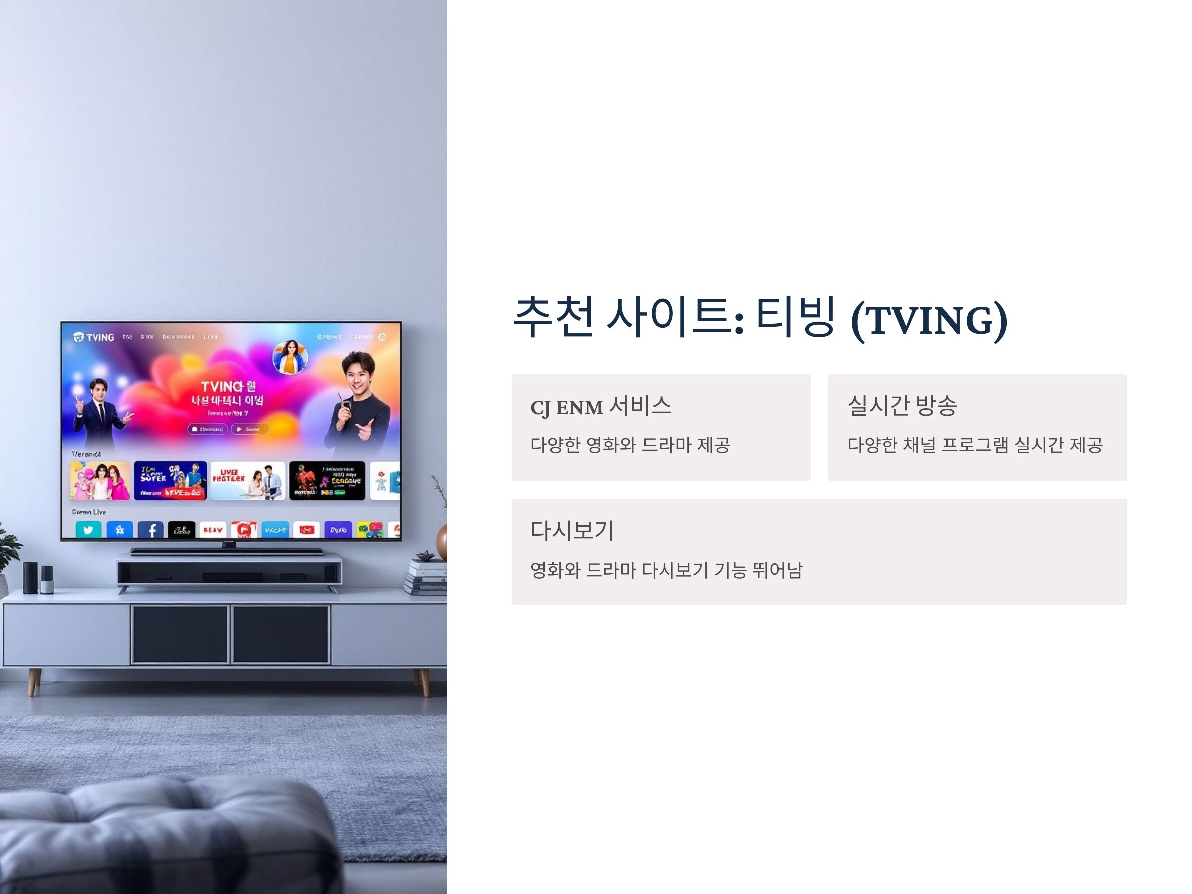 티빙은 CJ ENM에서 제공하는 스트리밍 서비스로, 다양한 영화와 드라마를 제공하고 있습니다. 일부 콘텐츠는 무료로 제공되며, 프리미엄 서비스를 통해 더 많은 고화질 콘텐츠를 볼 수 있습니다. 티빙은 다양한 채널의 프로그램을 실시간으로 제공하고, 영화와 드라마 다시 보기 기능도 뛰어나 인기를 끌고 있습니다.