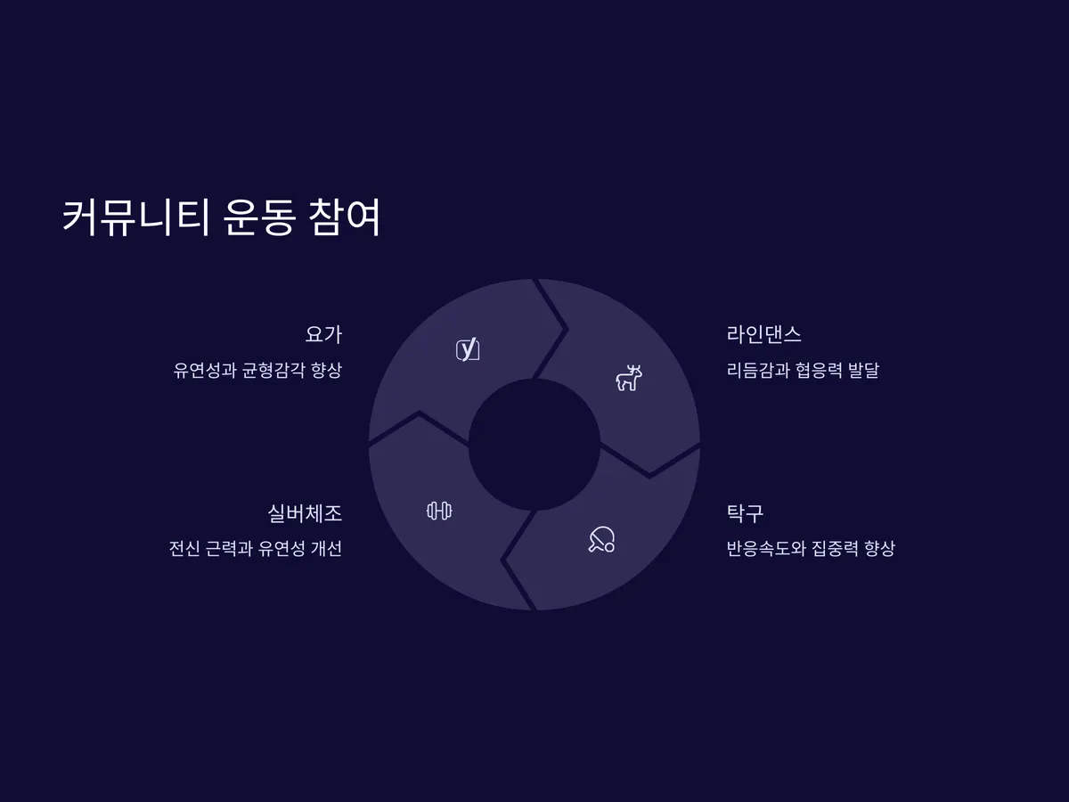 사회적 활동이 줄어드는 시기에 집에만 있으면 우울감이나 고립감이 심해질 수 있습니다. 이럴 때 지역 복지관이나 주민센터에서 운영하는 시니어 운동 프로그램에 참여해보세요. 요가, 라인댄스, 탁구, 실버체조 등 다양한 활동이 있으며, 대부분 무료 혹은 저렴한 비용으로 제공됩니다. 이런 커뮤니티 운동은 단순한 운동 이상의 가치를 지닙니다. 새로운 친구를 만들고, 소속감을 느끼며, 정기적으로 나갈 일이 생기므로 일상 리듬도 더 건강하게 유지할 수 있습니다.