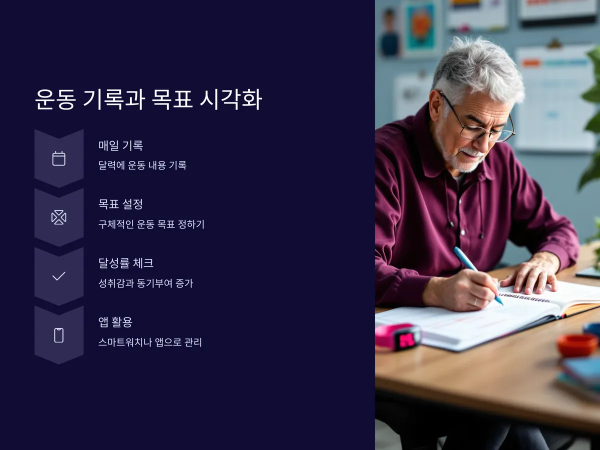 운동을 꾸준히 하기 위해서는 ‘기록’이 큰 힘이 됩니다. 달력이나 다이어리에 매일의 운동 내용을 간단히 적어보세요. 예를 들어 '걷기 30분', '스트레칭 15분', '스쿼트 3세트' 등으로 구체적으로 기록하면, 성취감을 느끼며 동기부여가 됩니다. 또한 목표를 설정하고 달성률을 체크하면 자기효능감이 높아져 운동 지속률이 확 올라갑니다. 요즘은 스마트워치나 앱을 통해 운동 기록을 관리할 수 있어 더욱 편리합니다. 단순한 습관이지만 건강을 지키는 데 매우 강력한 도구가 될 수 있습니다.