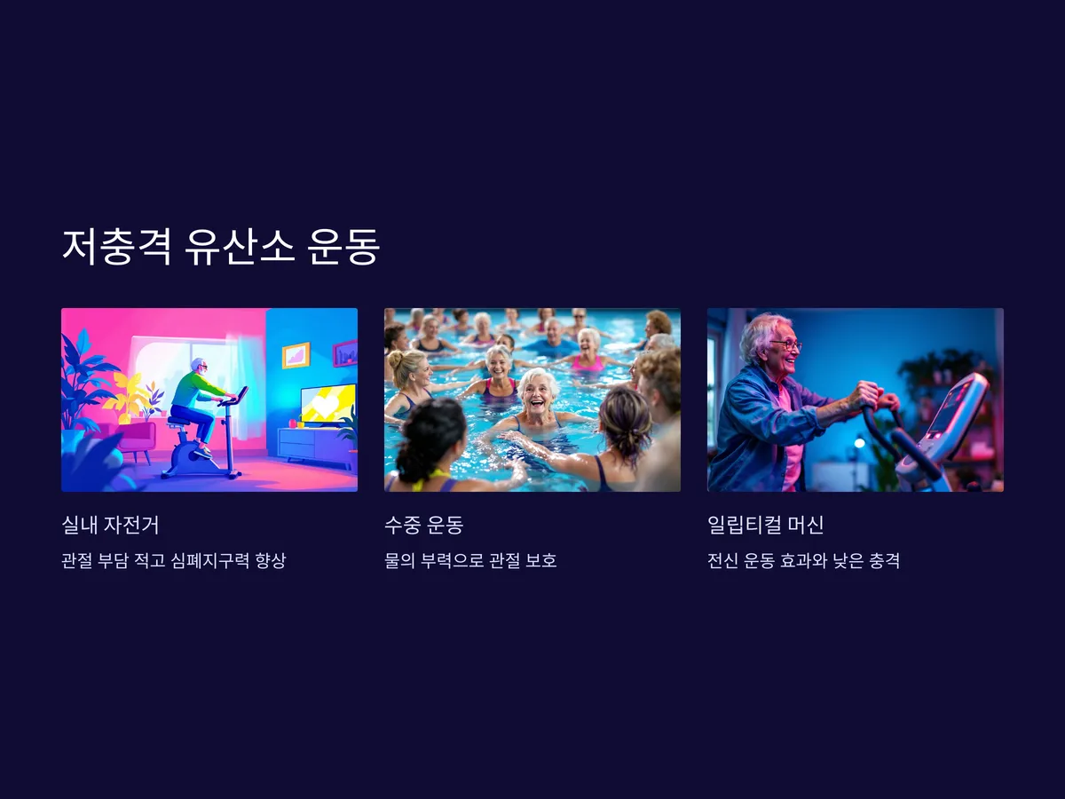 무릎 관절이 약한 분들이라면 걷기나 달리기 대신, 실내 자전거나 수중 운동 같은 저충격 유산소 운동을 추천합니다. 특히 실내 자전거는 날씨에 상관없이 언제든 할 수 있고, 관절에 부담이 적으면서도 심폐지구력을 기르기에 탁월합니다. TV나 음악을 들으며 가볍게 20~30분 정도 페달을 밟으면, 단조로운 운동도 재미있게 지속할 수 있습니다. 집에 여유 공간이 있다면 작은 실내 자전거를 구입해 보는 것도 좋고, 지역 헬스장에 주 2~3회 다니는 것도 좋은 선택입니다.