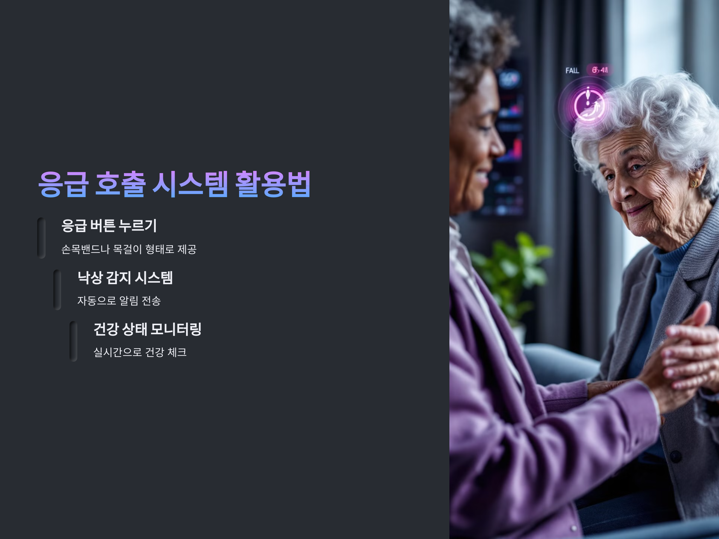 독거노인이 겪을 수 있는 가장 큰 위험 중 하나는 바로 응급 상황에서 도움을 받을 수 없다는 점입니다. 고립된 환경에서 사고가 발생하면 구조 요청 자체가 어려워집니다. 낙상, 심장 마비, 뇌졸중 등 긴급한 상황에서 즉각적인 도움을 받을 수 있는 응급 호출 시스템은 생명과 직결되는 문제입니다.