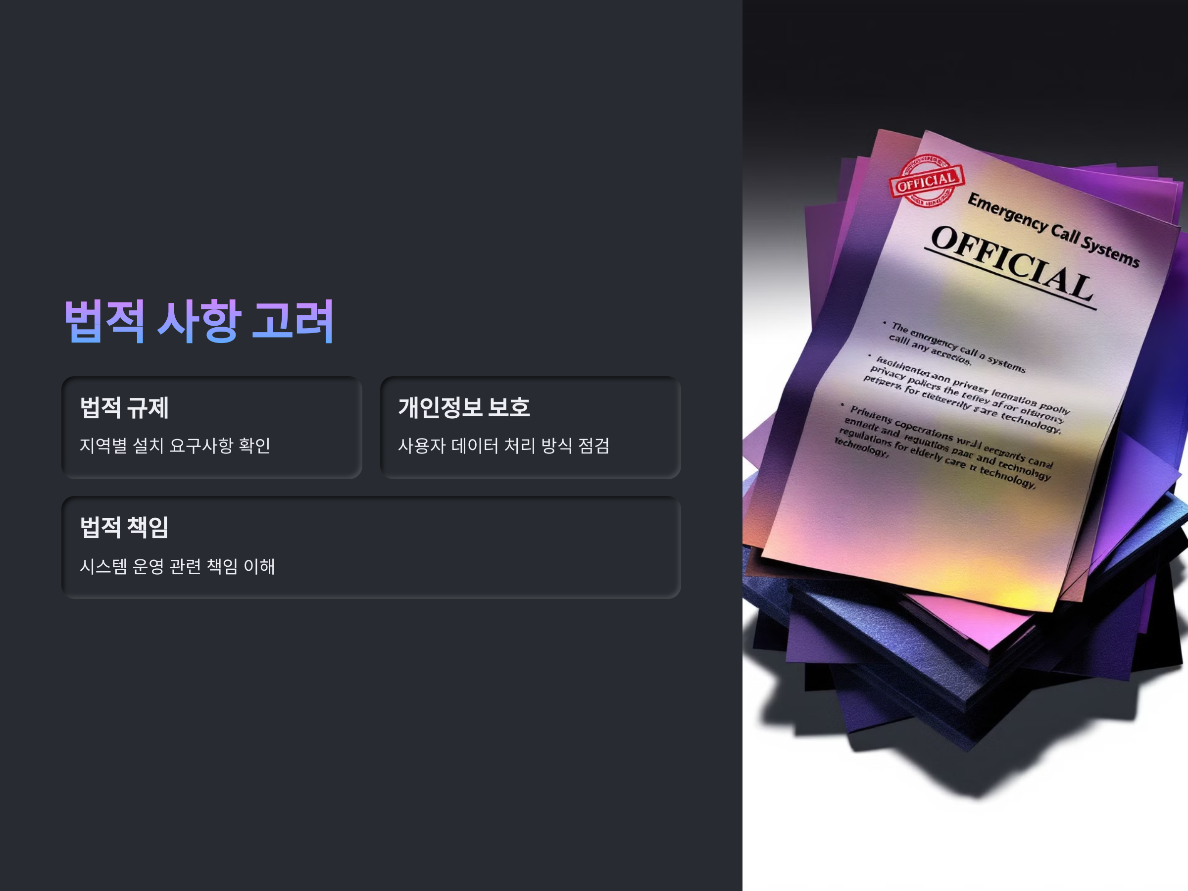 응급 호출 시스템을 설치하고 운영하는 데 있어서 법적인 책임을 다하는 것이 중요합니다. 특히 개인정보 보호와 관련된 법적 요구 사항을 충족하는지 반드시 확인해야 하며, 시스템 사용자의 개인 정보가 유출되지 않도록 철저히 관리해야 합니다.