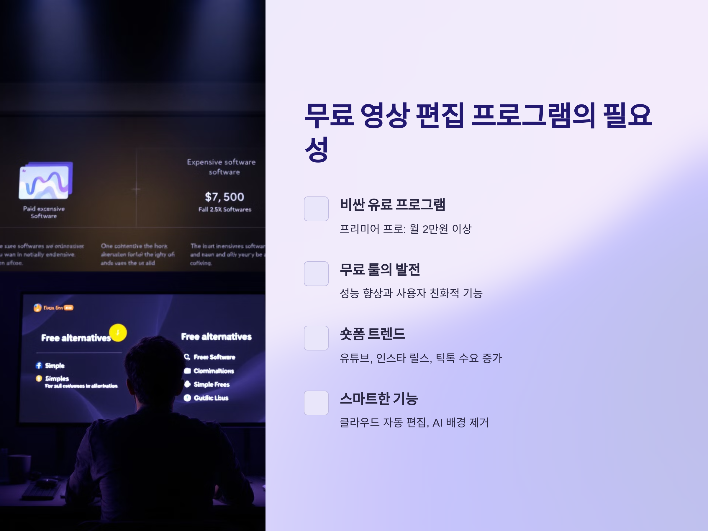 크리에이터들이 꾸준히 증가하는 지금, 영상 콘텐츠는 선택이 아닌 필수가 되어가고 있습니다. 하지만 전문 영상 편집 소프트웨어의 가격은 만만치 않죠. 2025년 기준, 어도비 프리미어 프로와 같은 유료 툴은 월 구독료가 2만 원을 넘고, 다빈치 리졸브 스튜디오는 평생 라이선스가 40만 원에 육박합니다. 이런 상황 속에서 무료 영상 편집 프로그램이 큰 주목을 받고 있는데요. 과거와 달리 성능도 뛰어나고 사용자 친화적인 기능들이 계속해서 추가되며, 입문자와 전문가 모두에게 현실적인 대안으로 자리 잡고 있습니다. 특히 유튜브, 인스타 릴스, 틱톡 등의 숏폼 영상 트렌드가 지속되면서, 가벼운 편집이 가능한 무료 툴 수요가 급격히 증가하고 있는 상황입니다.