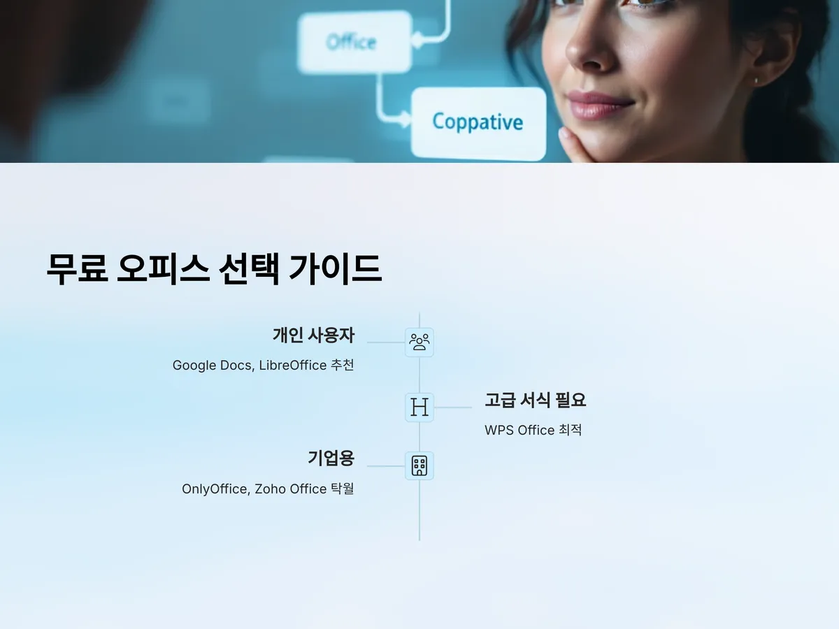 무료 오피스 프로그램은 사용자의 용도와 환경에 따라 선택지가 달라집니다. 단순 문서 작업 위주의 개인 사용자라면 Google Docs나 LibreOffice가 적합하며, 고급 서식과 워드 호환이 중요하다면 WPS Office가 최적의 선택입니다. 기업용으로는 OnlyOffice나 Zoho Office가 협업 효율성과 보안 측면에서 탁월한 성능을 보여줍니다.