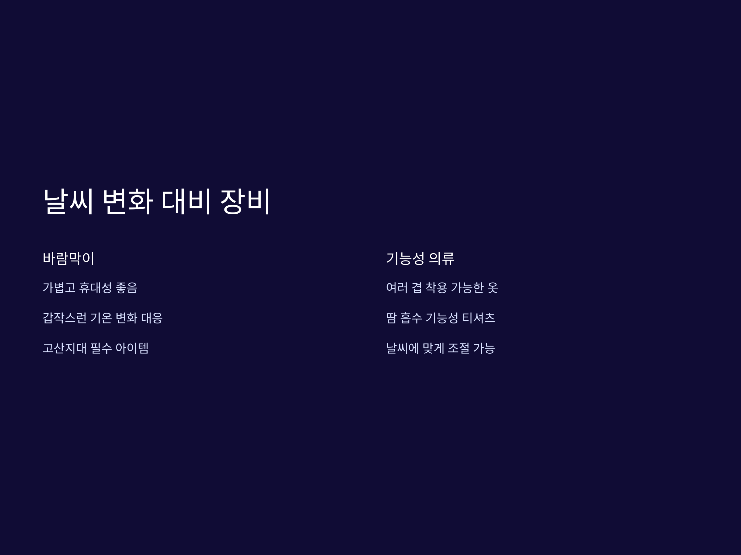 등산을 할 때는 날씨가 언제 바뀔지 알 수 없으므로, 날씨 변화에 대비할 수 있는 장비도 필요합니다.
