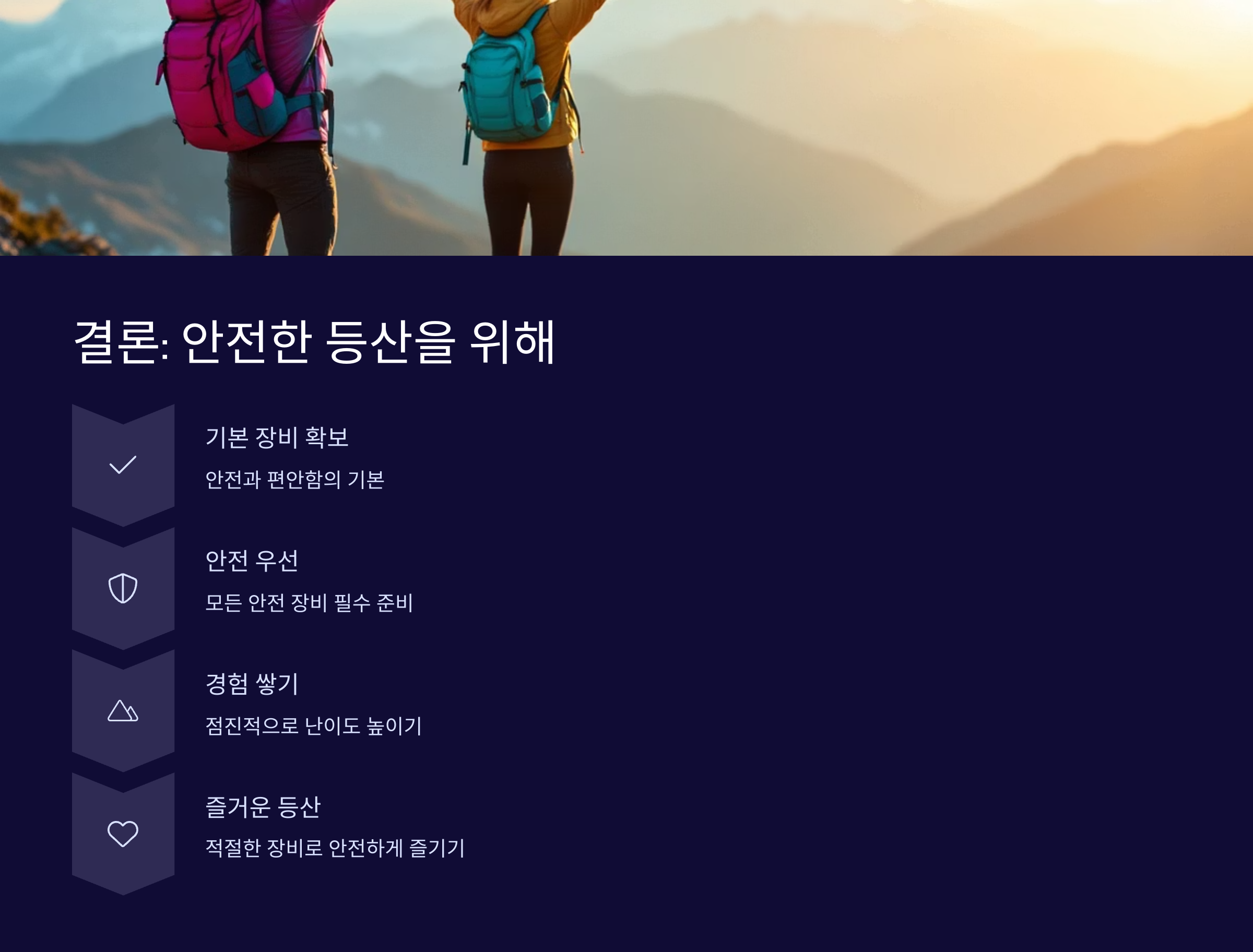 등산에서 중요한 또 다른 요소는 안전입니다. 초보자는 무엇보다 안전을 우선시해야 하므로, 각종 안전 장비를 갖추는 것이 중요합니다.