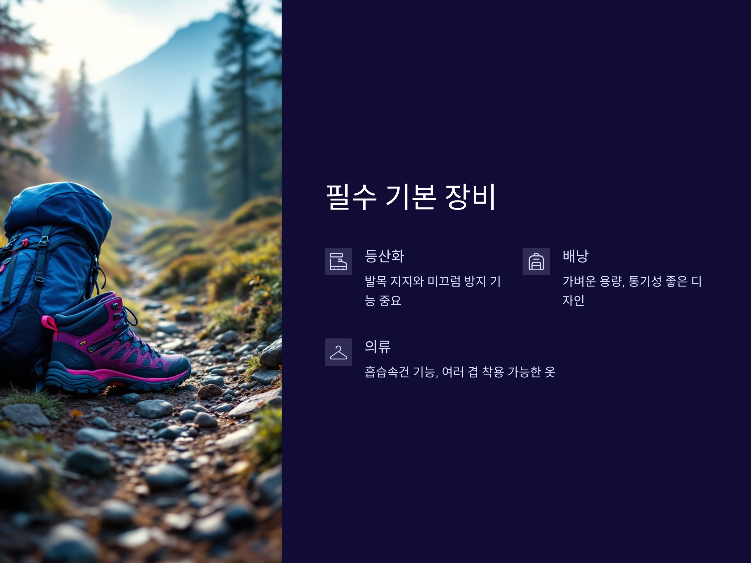 등산 초보자라면 우선 기본적인 장비를 갖추는 것이 중요합니다. 이 장비들이 없다면 안전하게 산행을 할 수 없기 때문에 반드시 준비해야 합니다.