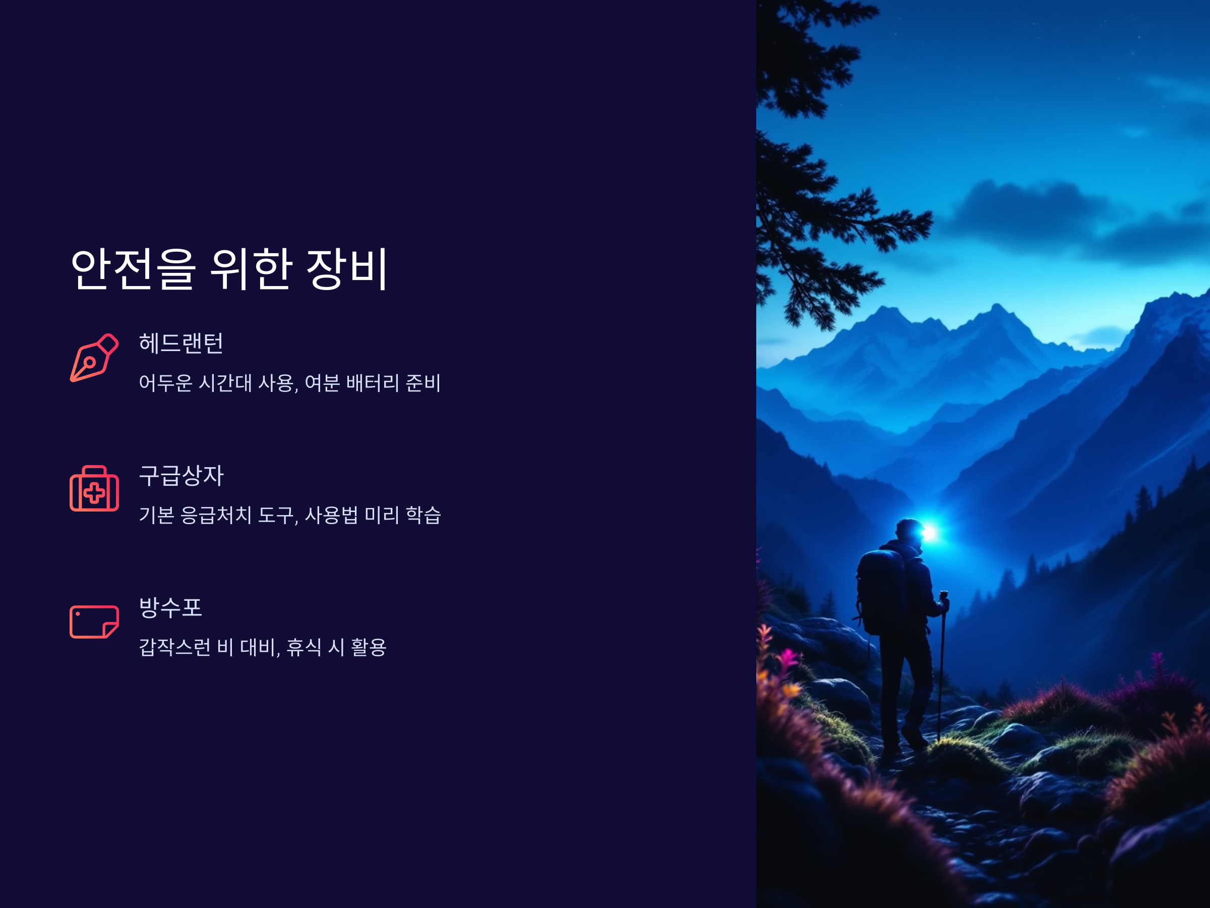 헤드랜턴은 손을 자유롭게 사용할 수 있어 매우 유용한 장비입니다. 특히 일출이나 일몰 전후, 흐린 날씨 등 어두운 시간대에 유용하게 사용할 수 있습니다. 또한, 배터리가 충분한지 확인하고 여분의 배터리를 준비하는 것이 좋습니다.