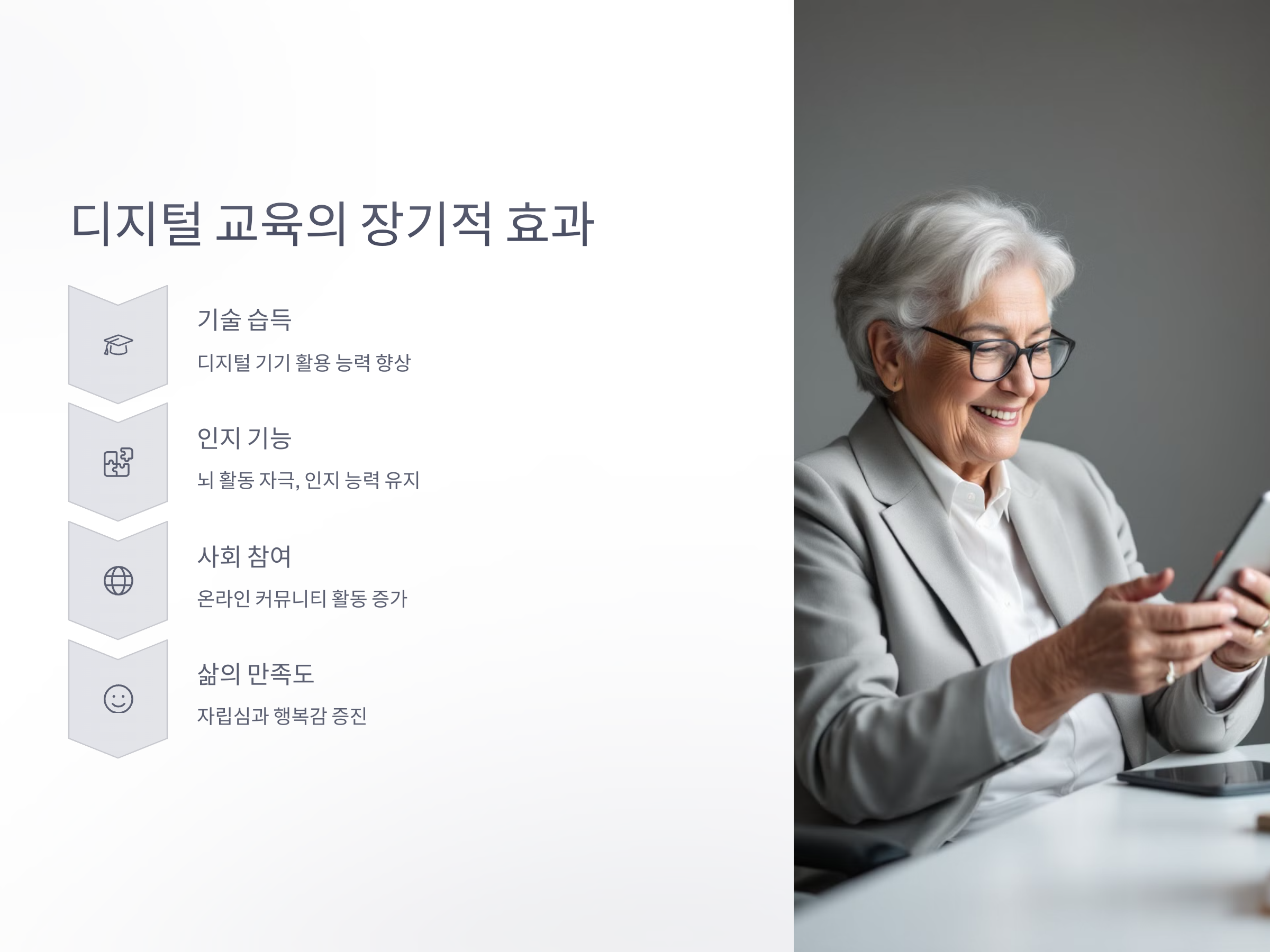 셋째, 디지털 기술을 배우는 과정은 노인들의 자존감을 높이고, 정신 건강에도 긍정적인 영향을 미칩니다. 디지털 기술을 배우고 이를 활용하는 경험은 노인들에게 자신감을 주며, 새로운 도전을 극복하는 성취감을 안겨줍니다.